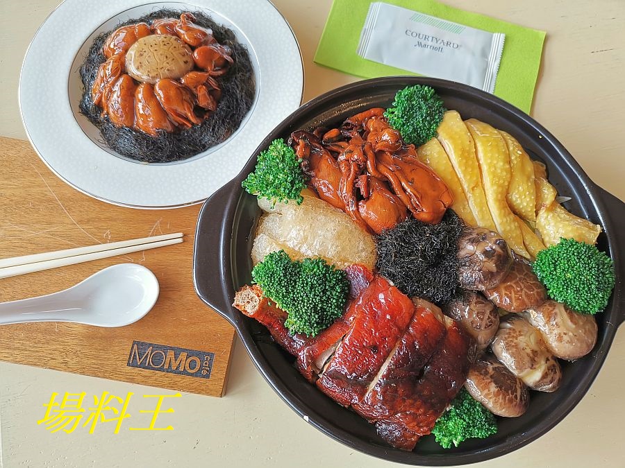 香港沙田萬怡酒店 MoMo Café 特意於 2 月 5 至 7 日加推新春賀歲自助晚餐,新增一系列賀年菜式,最搶眼的算是寓意團圓和盆滿缽滿的盆菜,材料豐富的八寶盆菜 (下圖) 包括白切雞、燒腩、豬脷、燒鴨、炸豬皮、白蘿蔔、墨魚丸及支竹,材料豐富,還有應節菜式如發財好市扣花菇、竹笙錦綉開春齋、發財瑶柱扒瓜甫等。