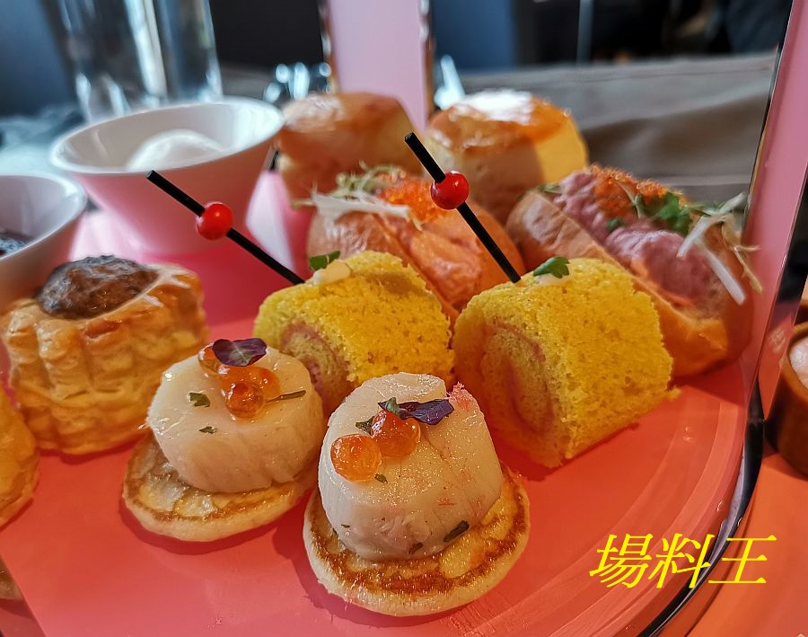 鹹點方面,有日本帆立貝及魚籽配咖啡忌廉芝士薄餅 (下圖中)、松露忌廉配蘑菇酥皮盒 (下圖左)、迷迭香火腿配蜜糖芥末醬瑞士卷 (下圖右),的骰小巧,讓大家可多吃幾款不同美點。