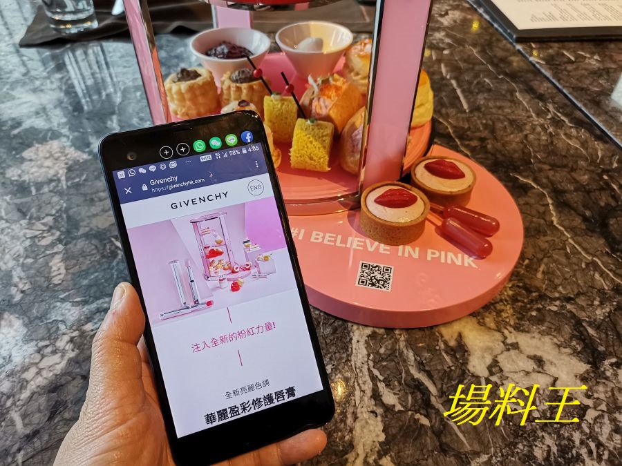 於「Givenchy I Believe in Pink」下午茶展示架底部,原來印有一個 QR Code,大家只要一掃便可瀏覽到有關 Givenchy 全新 LE ROSE PERFECTO 唇膏的資訊介紹。