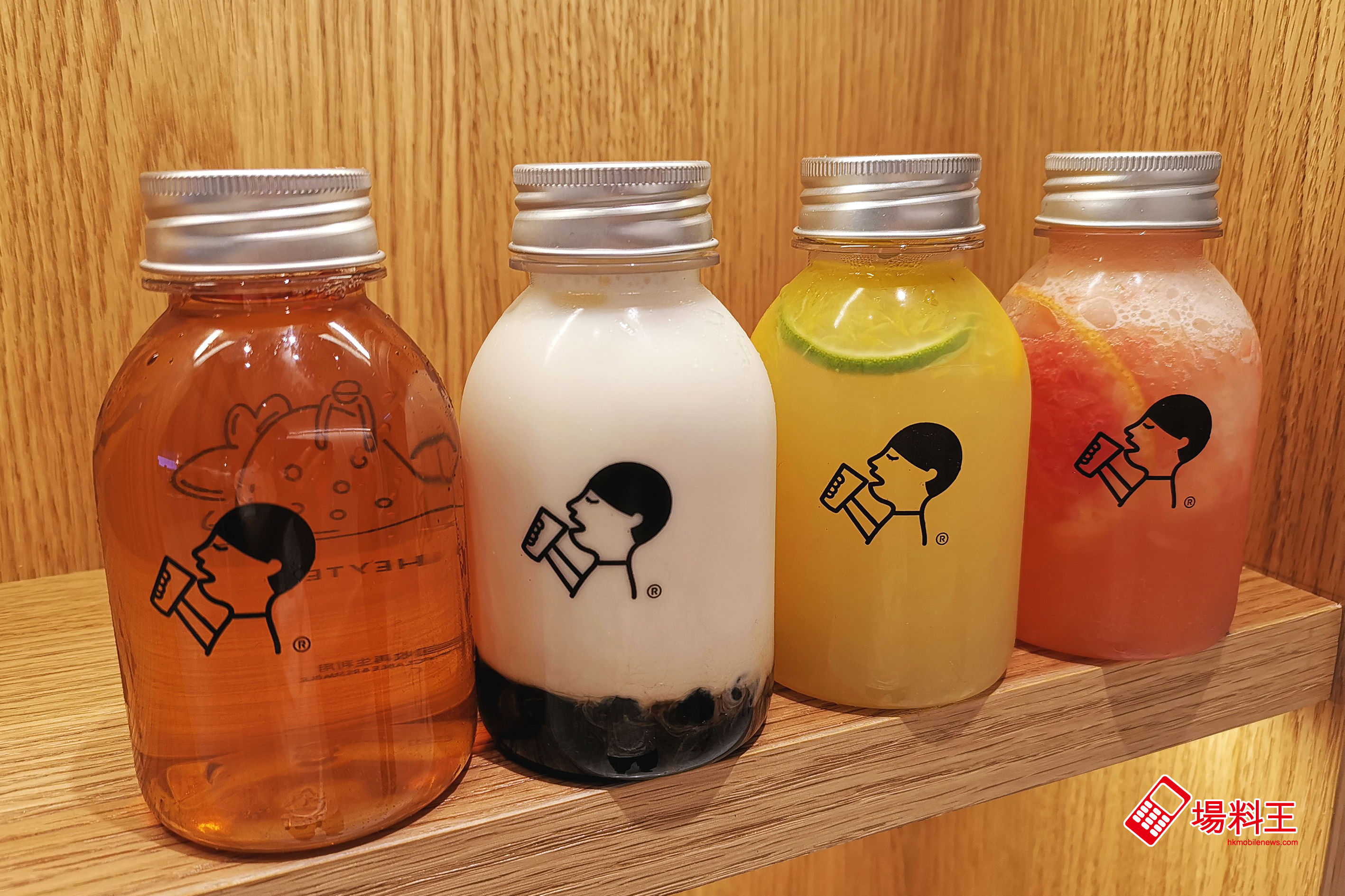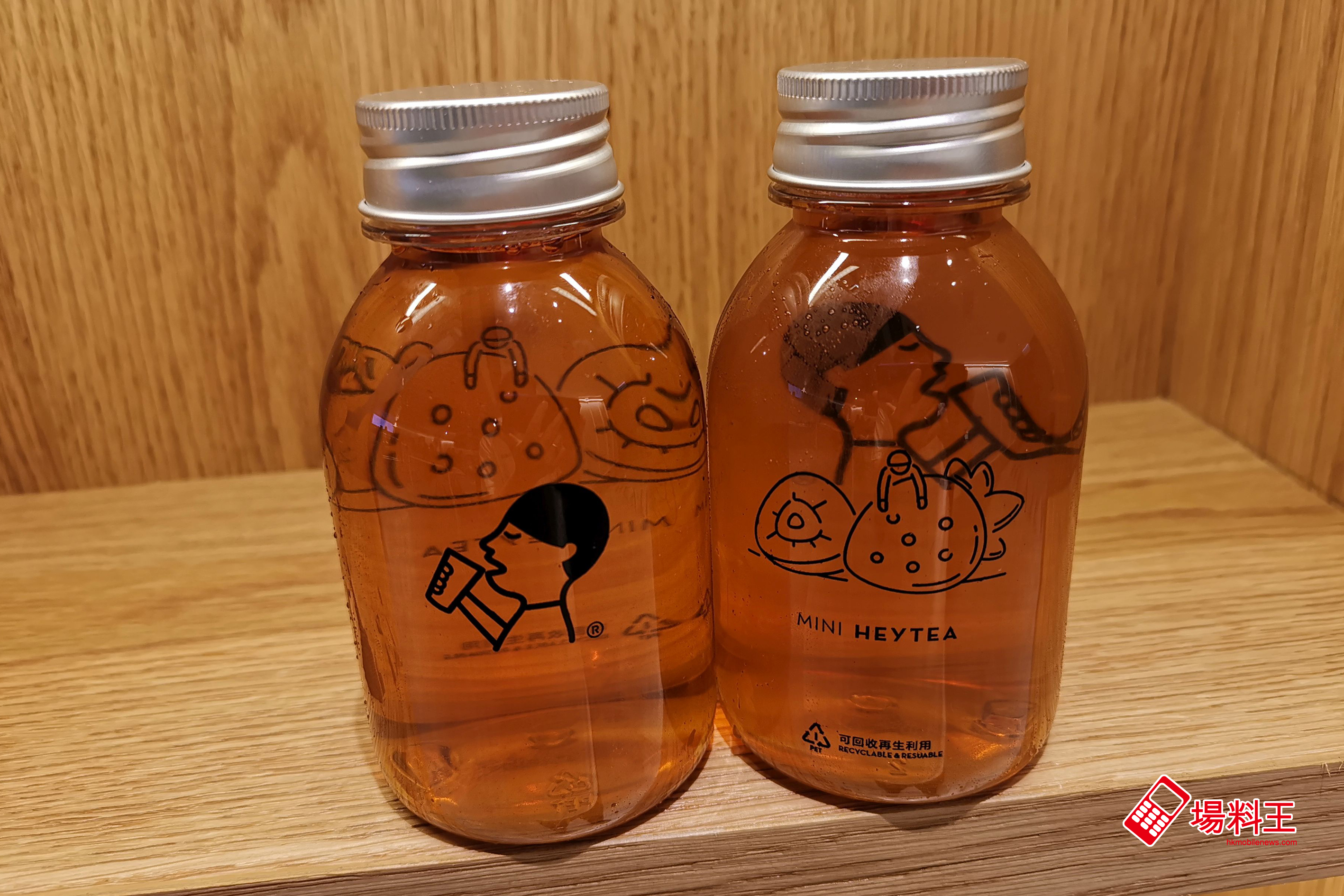 至於上文提到、今次首次登場的 mini 喜茶沒有單瓶裝提供,大家只可於 3 款固定組合中選擇,當中的必然「穩膽」就是純金玉,再配上另一支指定的飲料。mini 喜茶以透明膠樽設計,正面是喜茶的人像飲茶圖案,背面印有「MINI HEYTEA」字樣及水果的圖案,頗為可愛,不過樽上沒印有容量,據筆者目測應約為喜茶一般茶飲杯子的一半或稍多於一半左右。