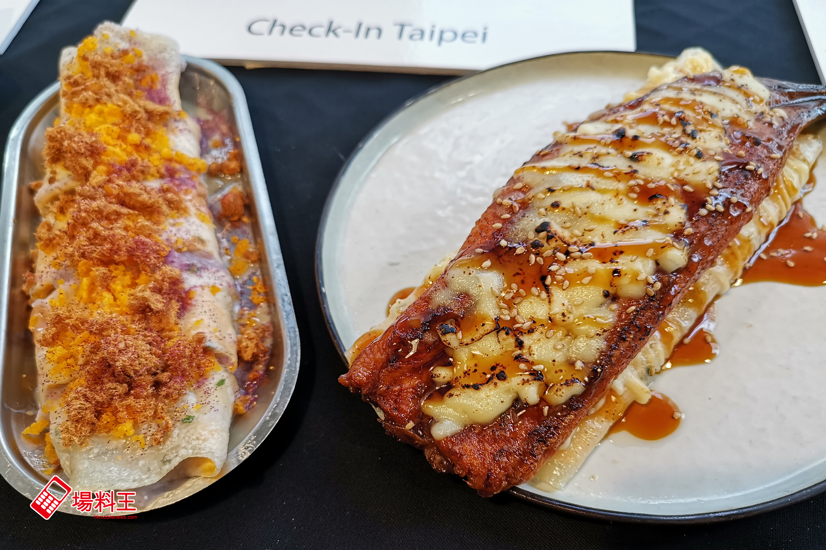 主打台式新派精緻料理的 Check-In Taipei,推出芋泥鹹蛋黃肉鬆蛋餅 ($60,下圖左)、火焰鰻魚起司玉米蛋餅 ($80,下圖右)、芋圓奶茶布丁 ($40)、芋泥草莓蛋糕杯 ($60)。