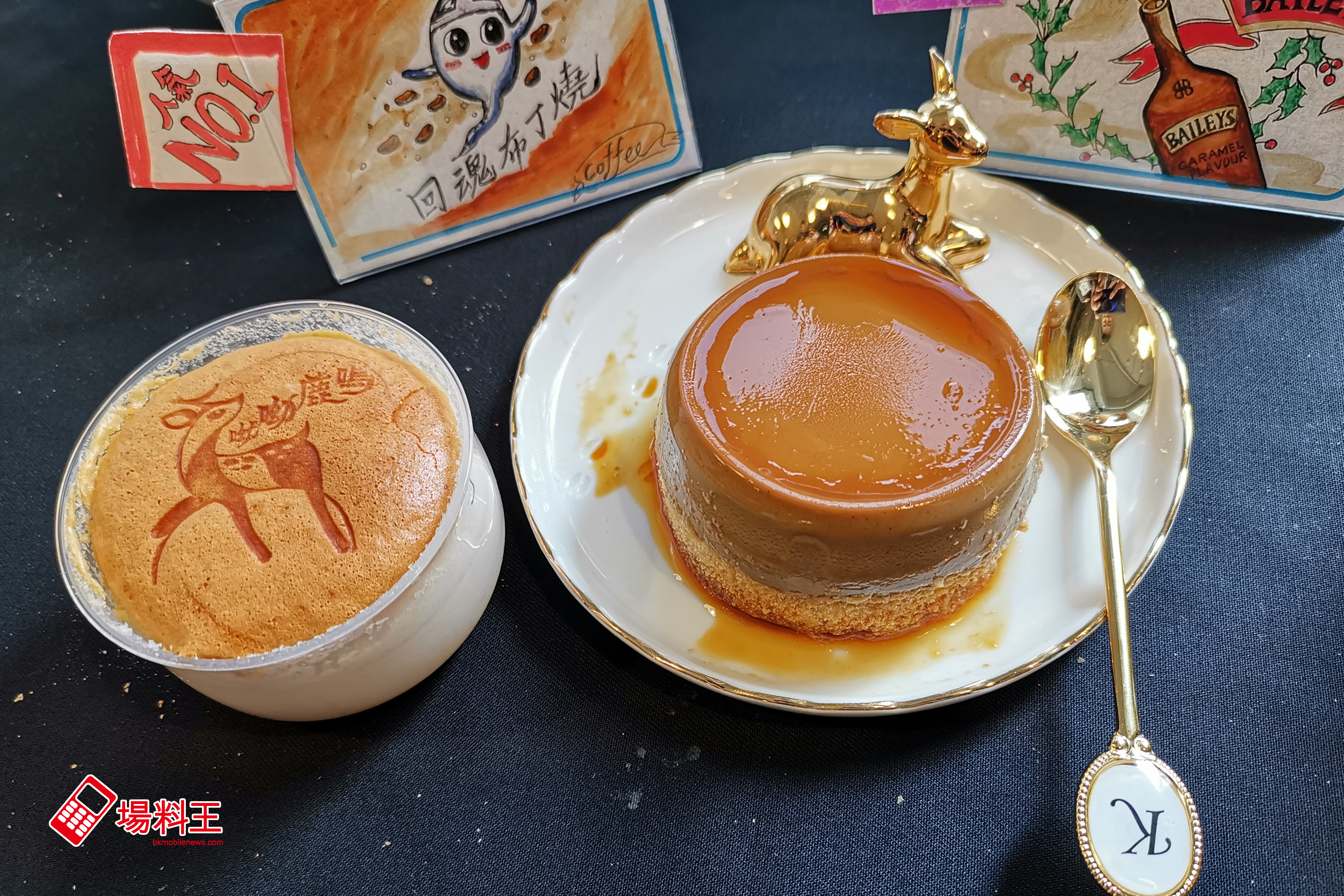 自家研製布丁燒的呦呦鹿鳴布丁燒,在提拉米蘇布丁燒 ($40,下圖左)、特濃百利甜酒布丁燒 ($40,下圖右) 外,更將「水果之王」榴槤加入布丁燒,推出榴槤布丁燒 ($80)。
