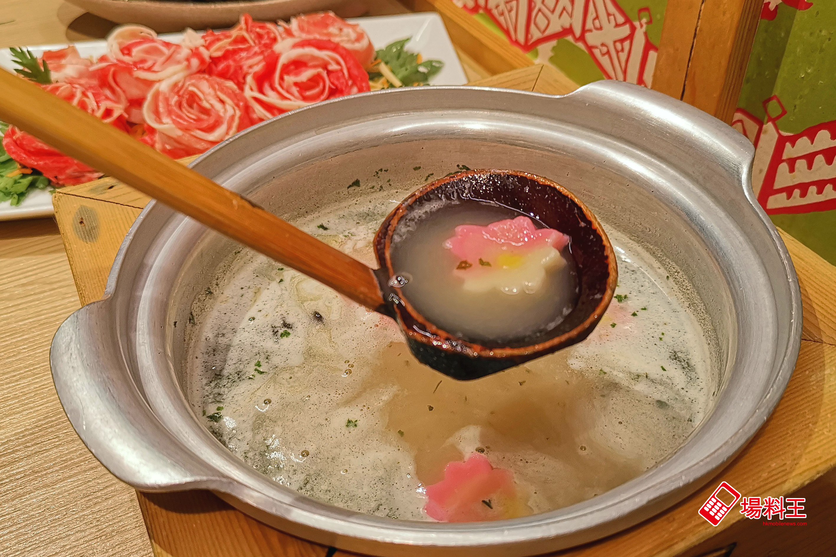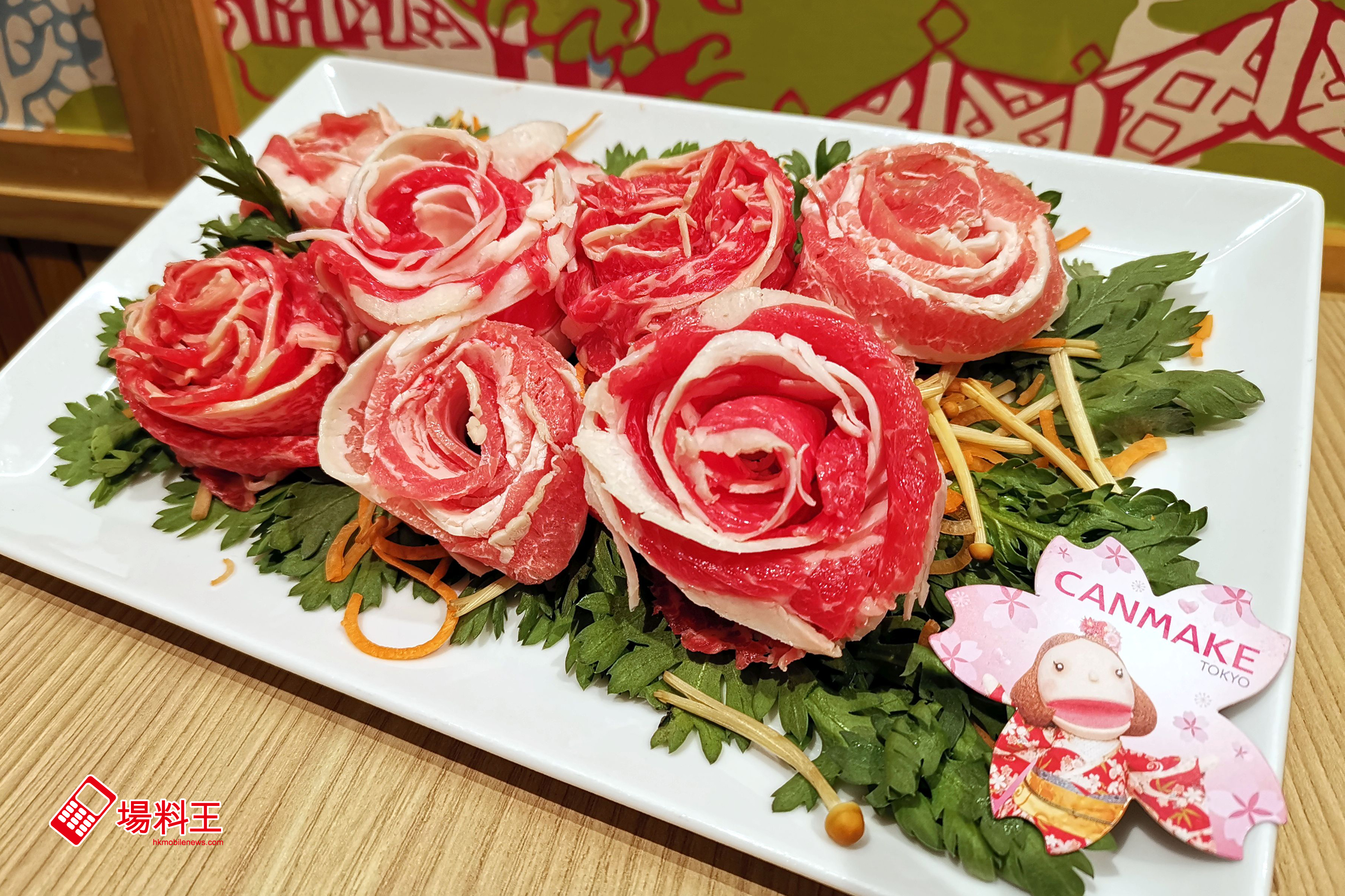 「櫻花鍋」定食提供 3 款肉片,當中除了油花分佈均勻的英國安格斯牛肋肉、美國牛胸腹肉外,還有飼養時間比一般豚肉長 1 個月的冲繩飛天豚腩肉 (單點價:$59),配搭櫻花梅子雞湯更能引發出肉片的清甜味道。
