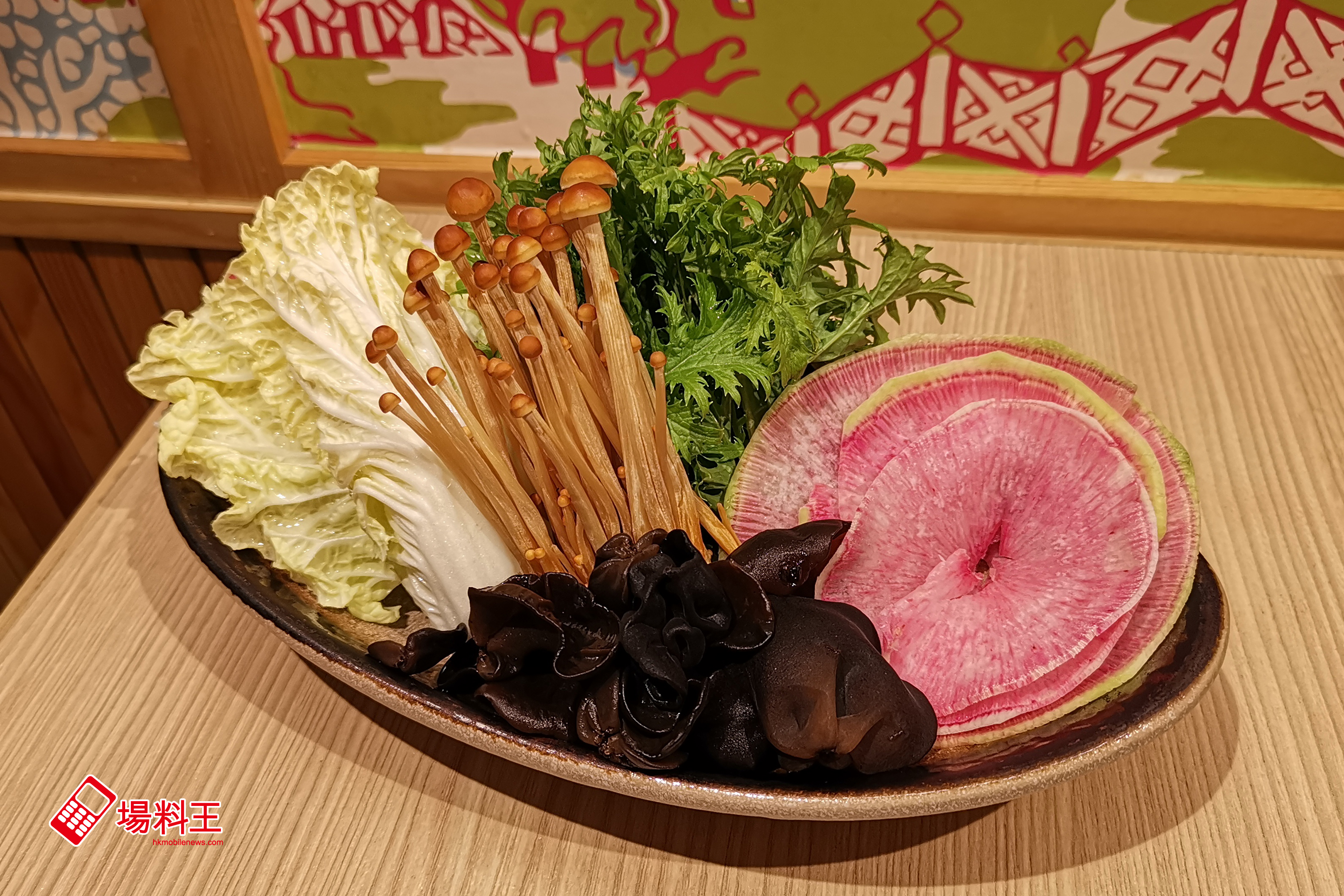 來到温野菜,除了肉食,當然少不了菜,而「櫻花鍋」定食內有 5 款時令野菜,如筆者試吃當天更有啡金菇及較爽口的紅心蘿蔔片;另定食附送烏冬或飯,故男生也不用擔心吃不飽。