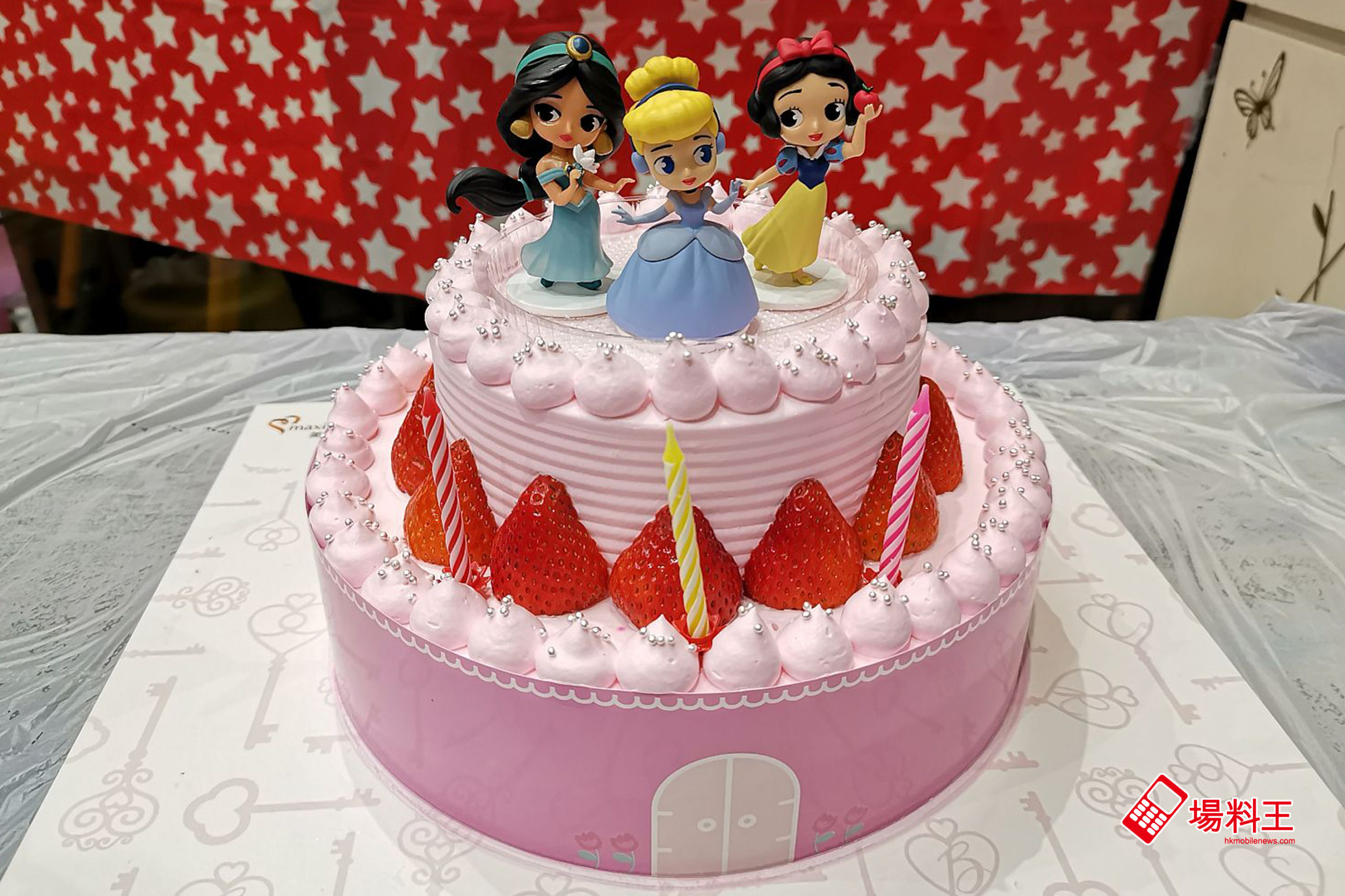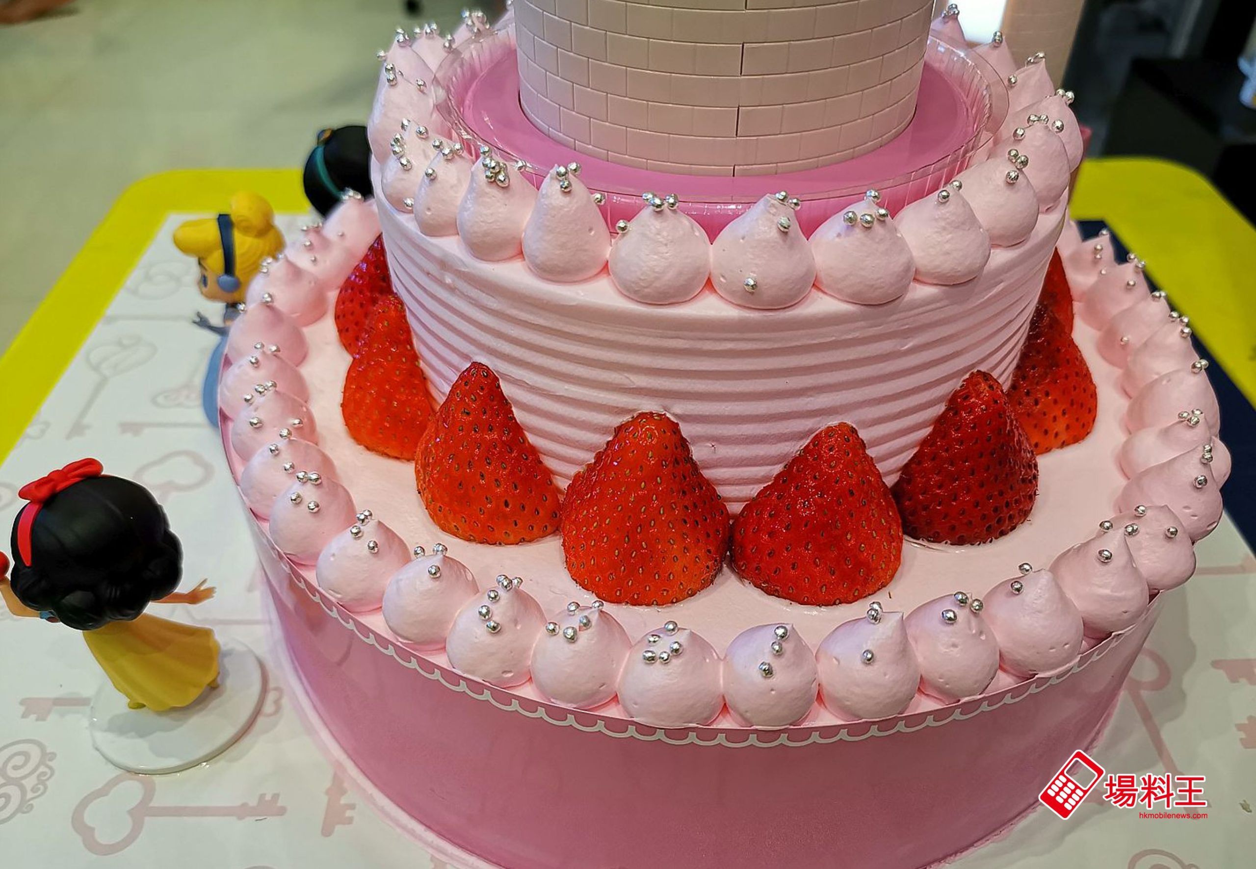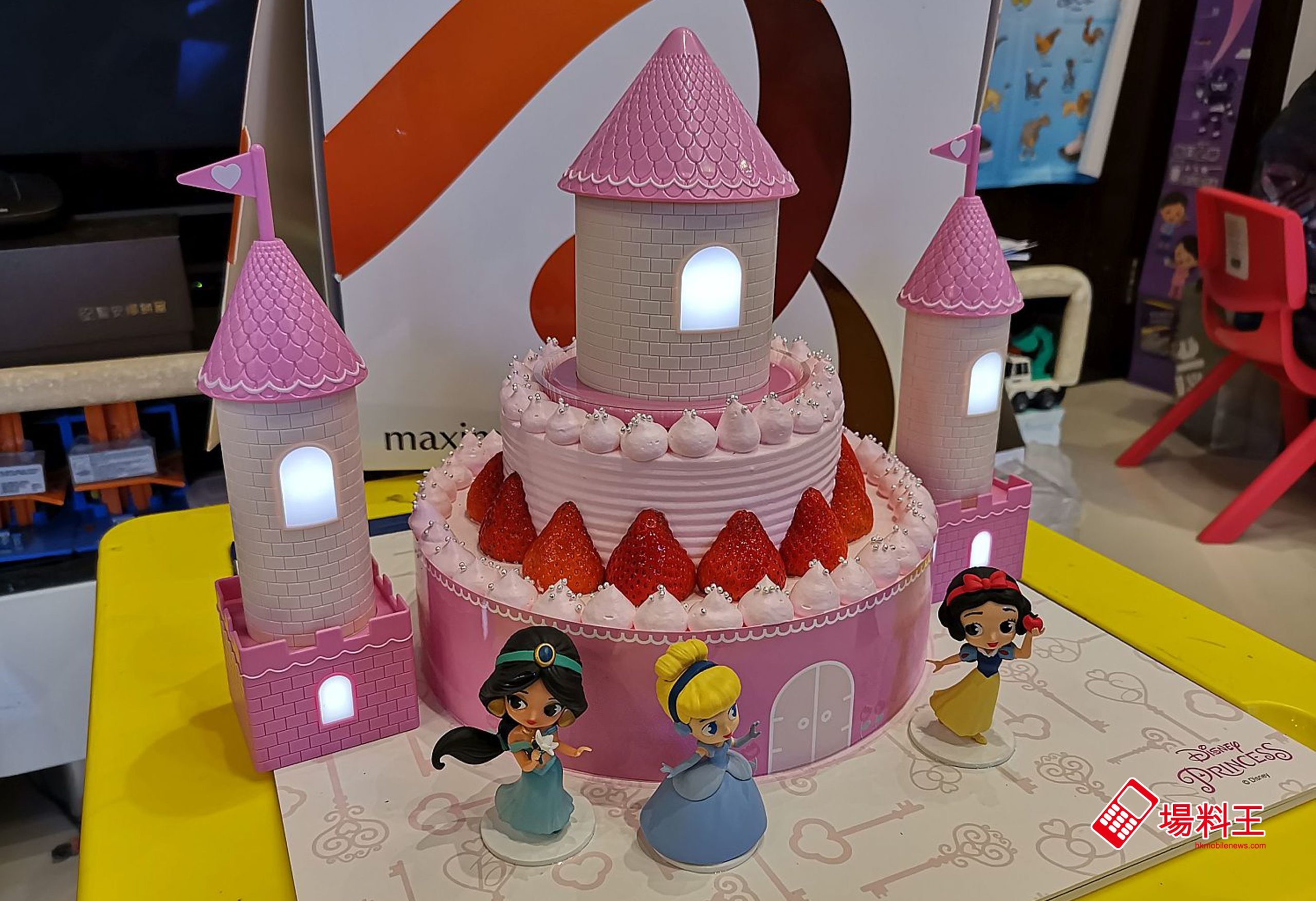 「公主夢幻發光城堡蛋糕」約有 9 吋大,重 3.1 磅,而會附送《白雪公主》的白雪公主、《仙履奇緣》的仙杜瑞拉公主和《阿拉丁》的茉莉公主的 Q 版公仔,造型可愛。