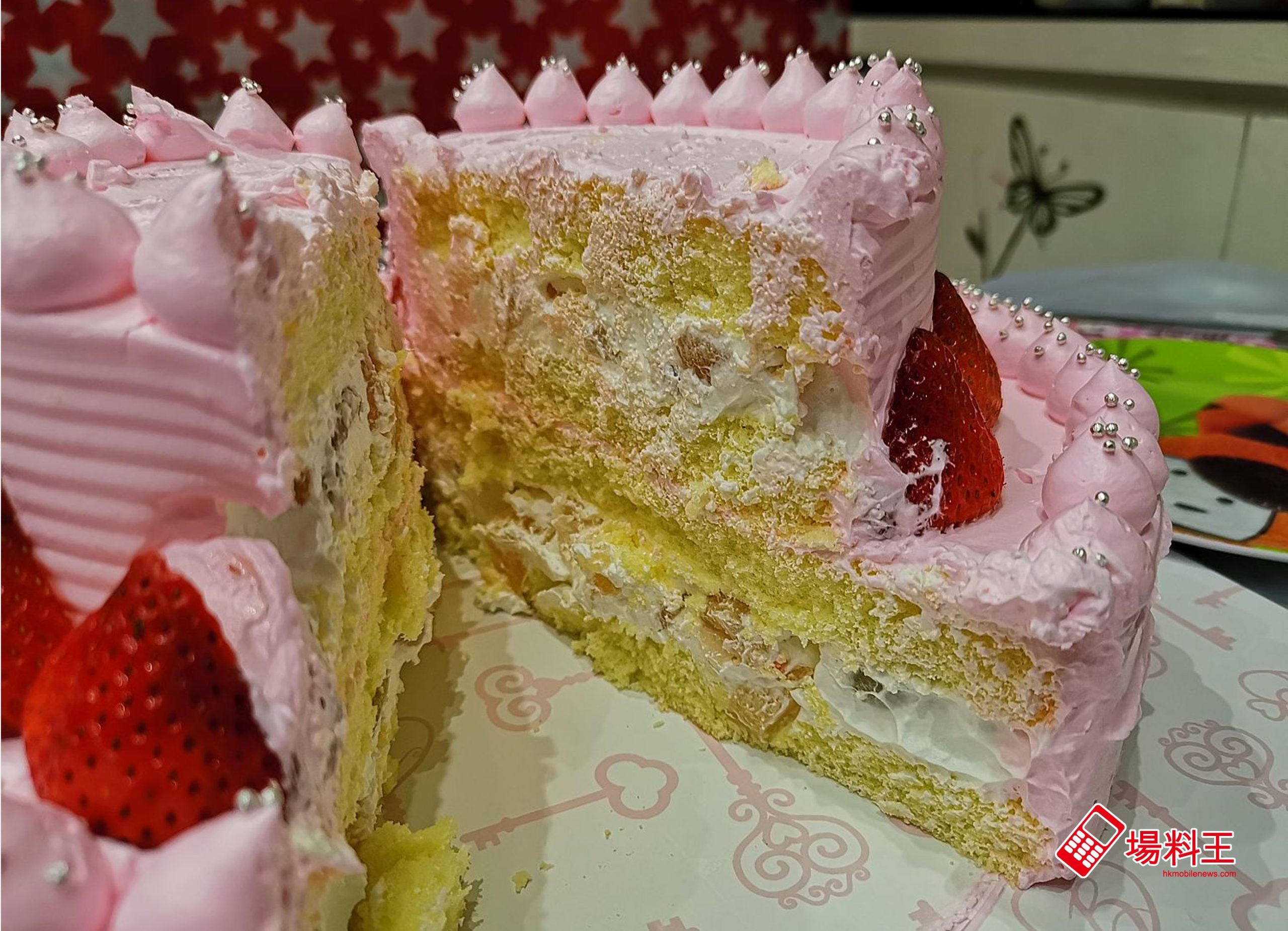 至於蛋糕方面,整個蛋糕以淺粉為主色調,外層抹上層層濃厚幼滑的花式忌廉,再環繞鋪上色澤鮮艷、酸酸甜甜的士多啤梨,單看已令人有澎湃的少女心,十分吸睛。