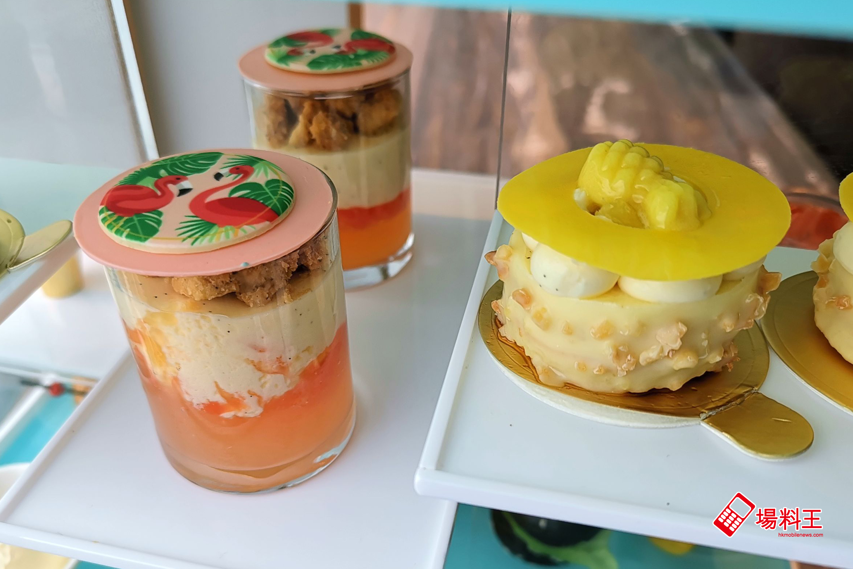 另一甜品杯「Pink Flamingos」(下圖左) 中載有粉紅葡萄柚啫喱和雲呢拿慕絲,加上香脆可口的牛油脆脆,頂部更是一片印有紅鶴圖案的白朱古力,絕對是這次下午茶的另一焦點所在。至於「菠蘿慕絲撻」(下圖右) 除了頂層的菠蘿餡料圈外,底層亦混有糖漿,所以整體稍嫌較甜。