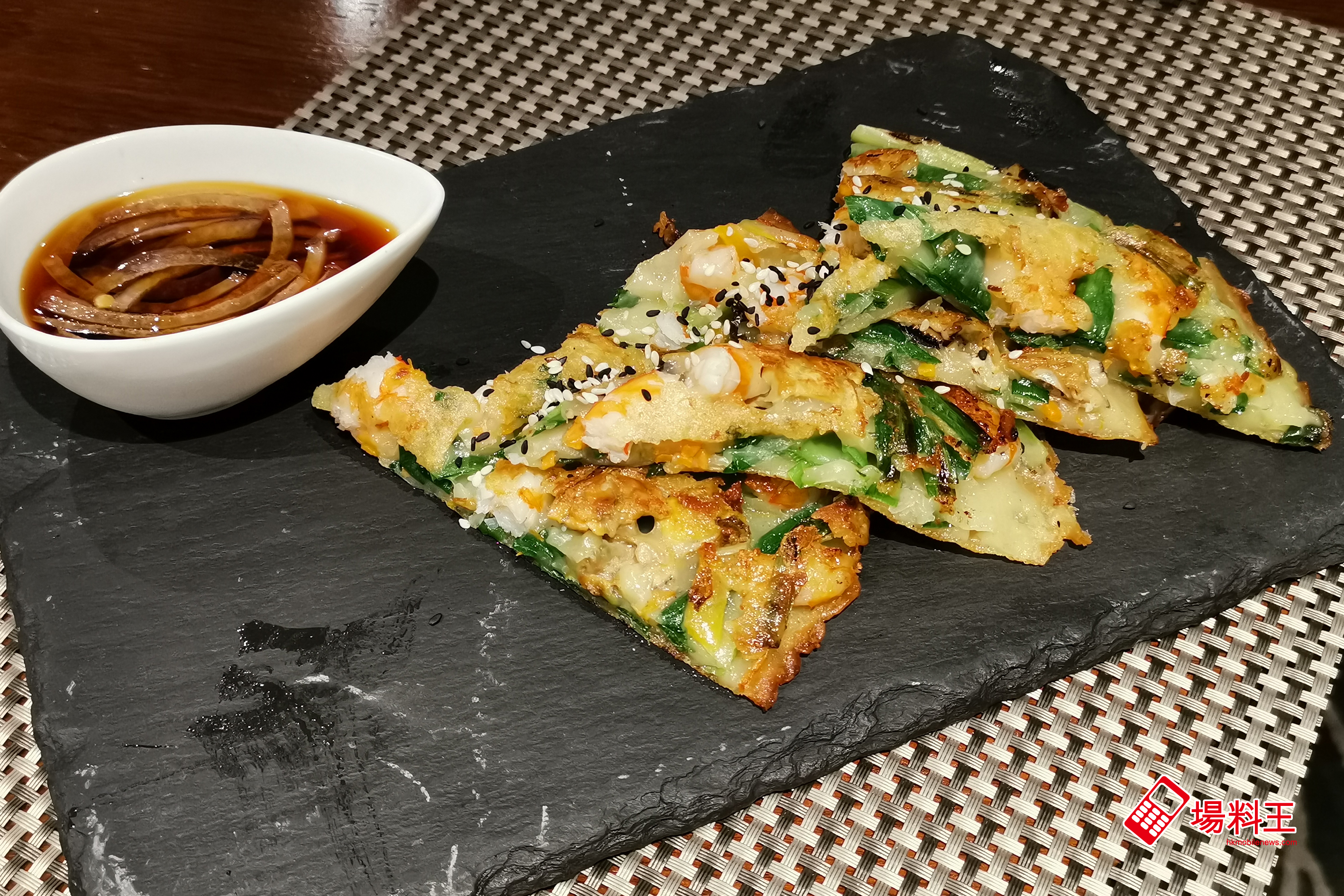 韓國海鮮產量豐富,海鮮煎餅正是韓國人常見的家庭料理。「韓式海鮮煎餅」先把鮮蝦、魷魚及青口等食材煎香,鎖緊肉汁,加入韭菜及用雞蛋和麵粉調配成的粉漿煎至兩面金黃,外脆內軟,再蘸一下加上洋蔥而帶酸的煎餅汁品嚐,美味加倍,也可減低油膩口感。