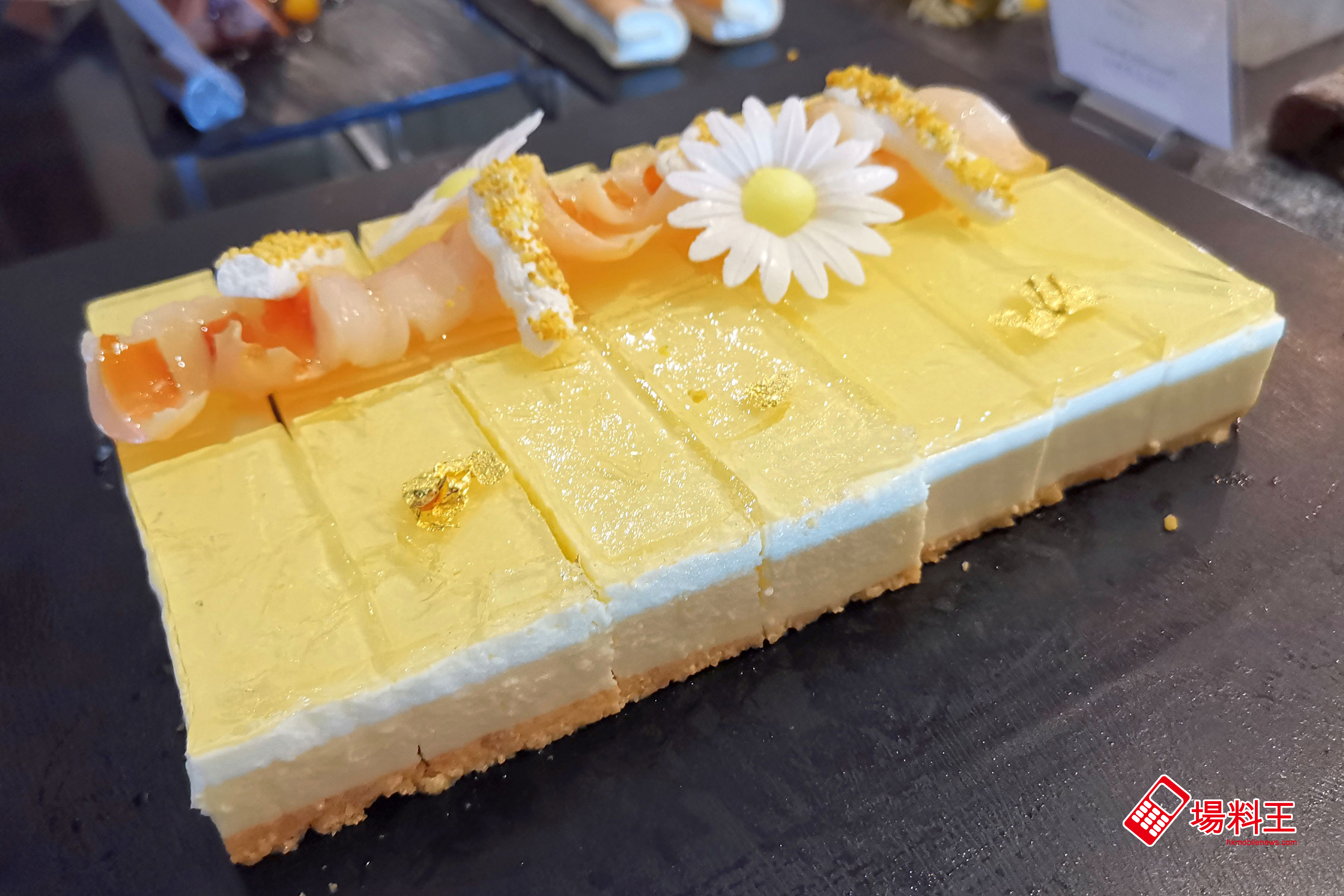 金黃色的長方型蛋糕上鮮花盛放的是「高知縣柚子蜂蜜慕絲蛋糕」,上層是晶瑩剔透的蜜糖啫喱,中間夾著以期間限定酸香多汁的高知縣柚子製成之幼滑慕絲,底層是鬆脆的消化餅碎,三層不同的口感、味道相互平衡,酸甜有致為大家消滯除膩。