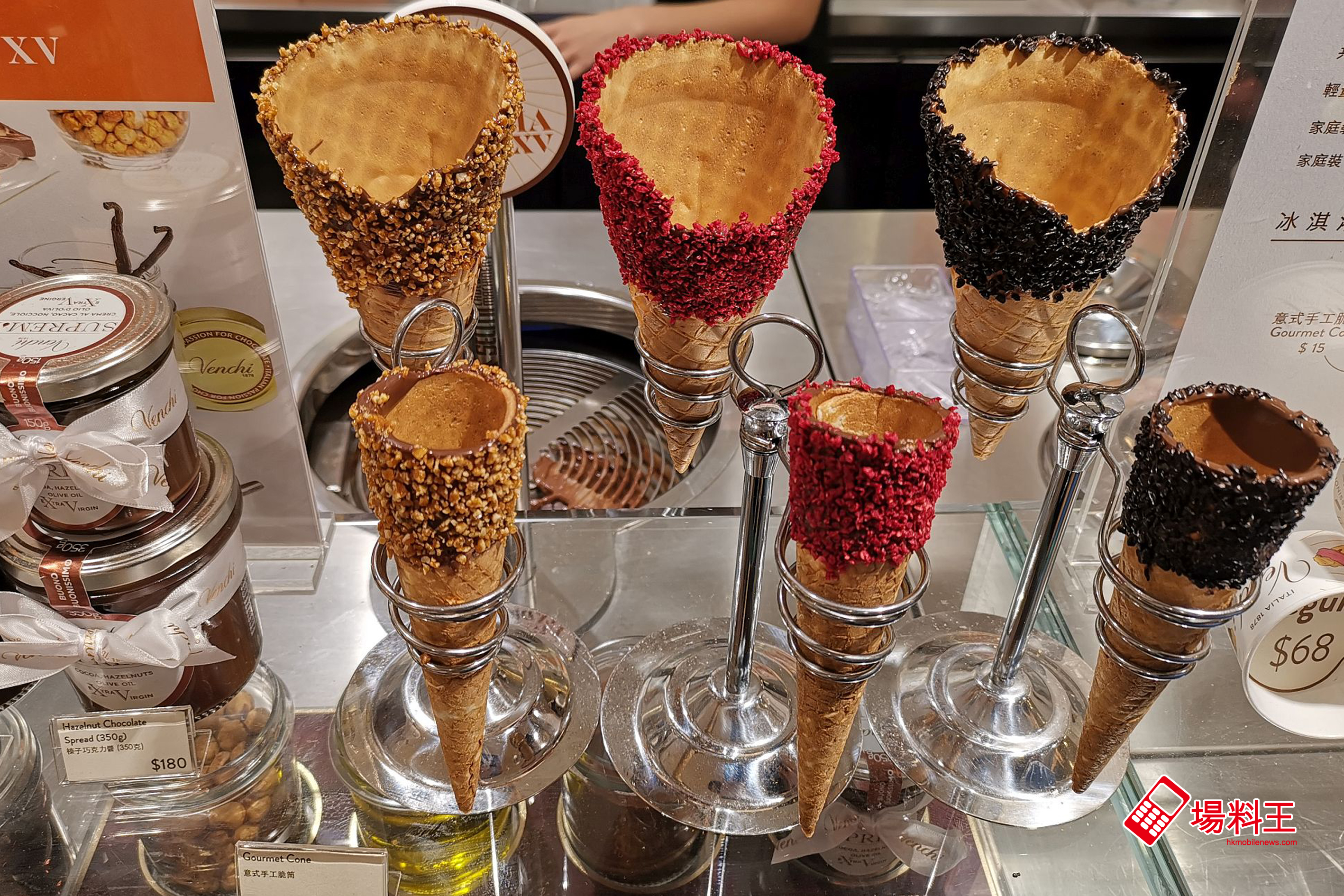 雖然意式手工脆筒價錢不算便宜,但除了以牛奶榛子預製成的筒身外,店員更會沾上半溶的朱古力漿,配合顧客自選的餡料碎同吃,更是惹味。