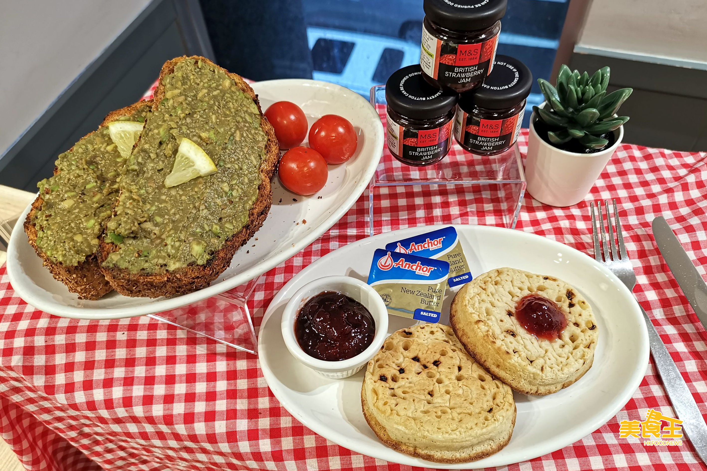 而英式烘餅配牛油及果醬($29/下圖右)的口感,比一般市面上更為鬆軟豐富,是必食之選。皇牌牛油果多士($49/下圖左)使用了健康新鮮的牛油果,麵包上佈滿厚厚的牛油果蓉,並加上罕見且未經上蠟的檸檬所搾出的檸檬汁,清新開胃,絕對食得安心又有信心。此外大家亦可根據個人口味,選擇每日新鮮出爐的石磨全麥麵包或傳統白麵包,所有麵團均由英國直送到香港,再新鮮焗製而成,簡簡單單便食到英國新鮮食材,幸福感滿載!