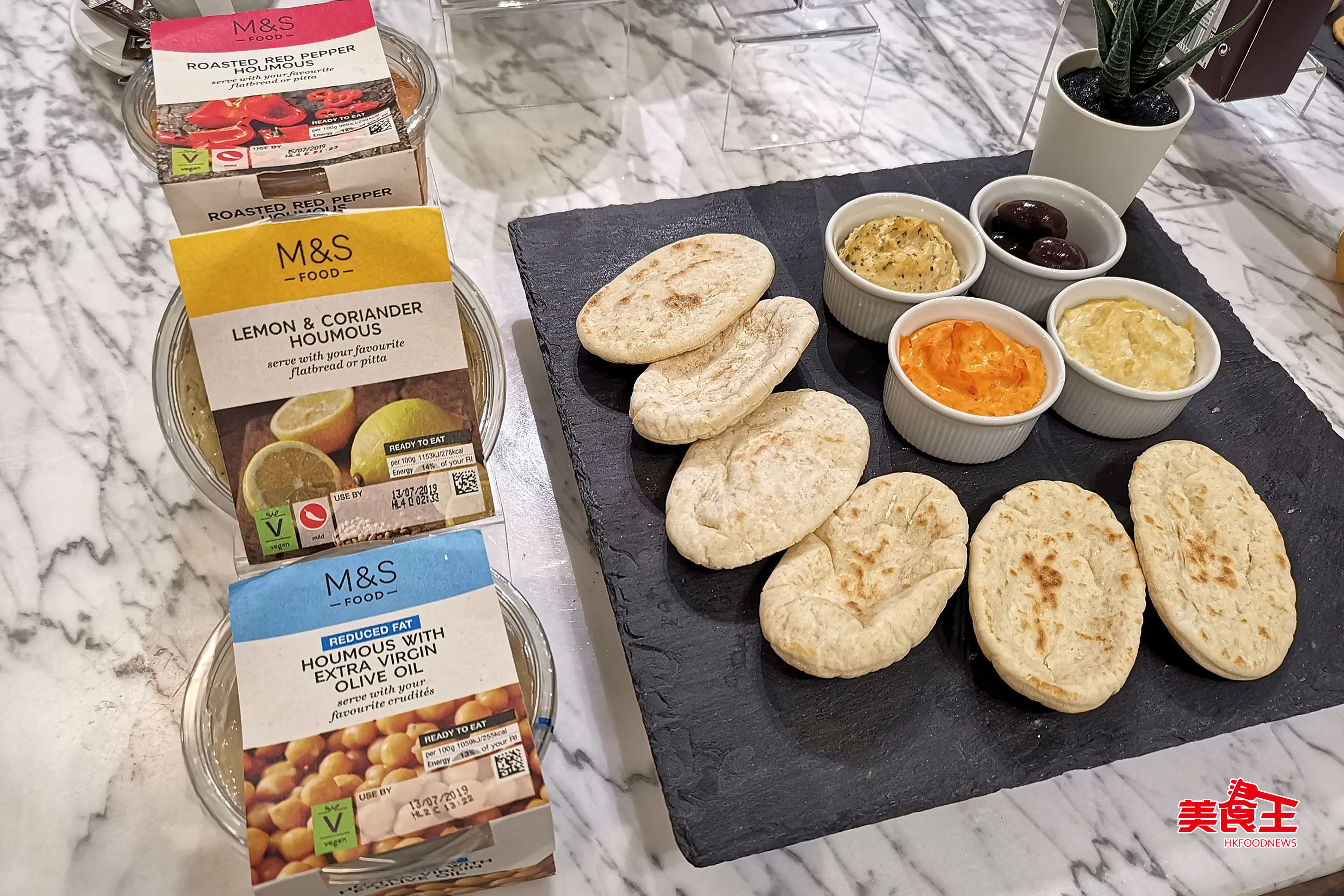 另外,M&S 的雞心豆蓉拼盤更以鬆軟的迷你中東口袋麵包配搭多款產自英國的精選雞心豆蓉醬($69),三款口味讓客人品嚐到較罕見的特級初榨橄欖油、特級初榨橄欖油紅椒中東及檸檬香茜的雞心豆蓉滋味醬,配菜更有希臘卡拉馬塔橄欖。以後只需以親民價格便可在此歎盡世界級美食!
