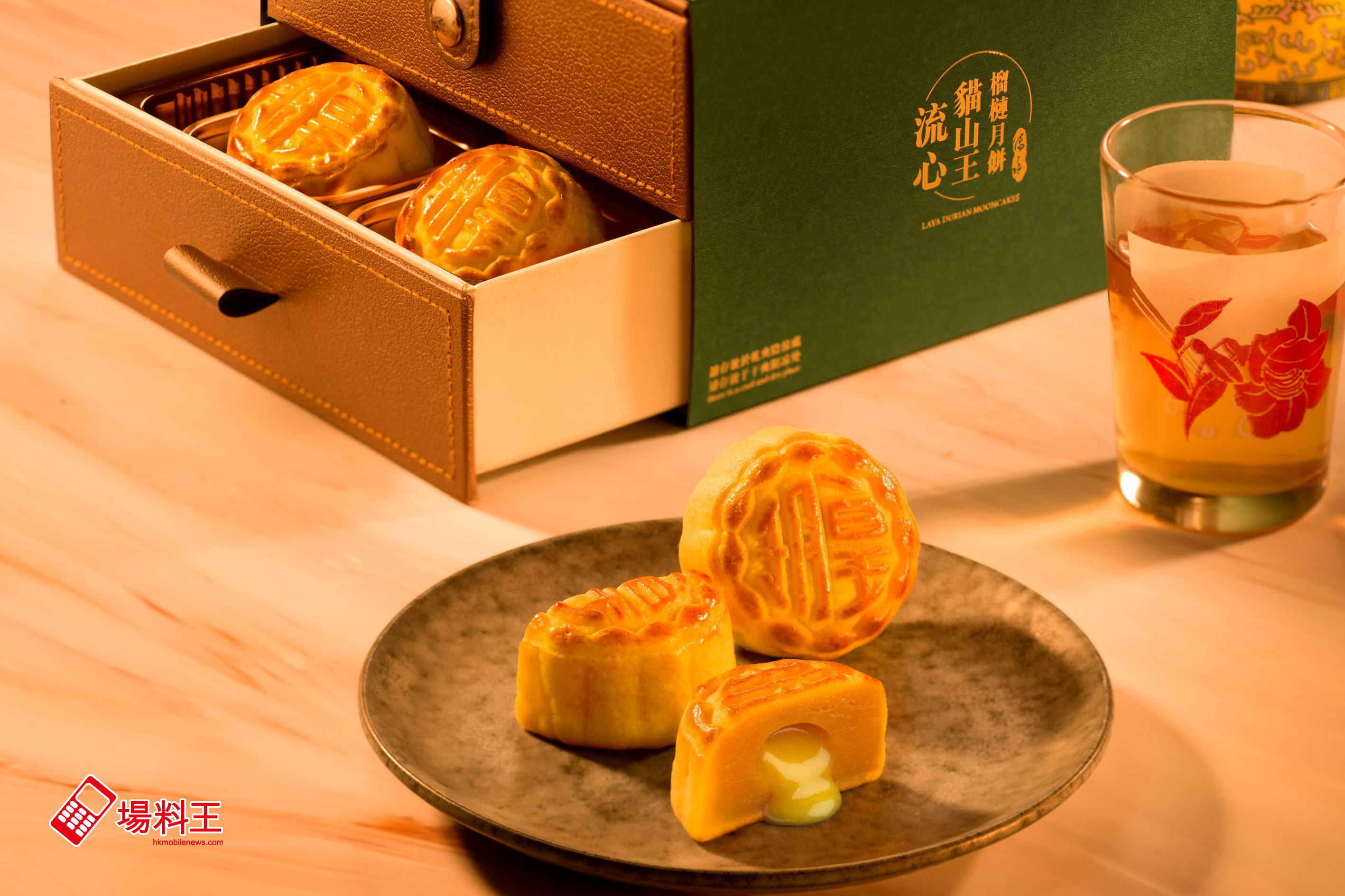 「皇玥流心月餅系列」除了把原有的流心奶黃月餅($198/4件、$378/8件)、流心芝麻月餅($378/8件)加以改良外,更新增了選用頂級貓山王榴槤果肉製的流心貓山王榴槤月餅($378/8件,下圖)、以新鮮生薑磨成薑汁後加入幼滑白蓮蓉中的流心薑汁白蓮蓉月餅($378/8件),讓大家有更多選擇。