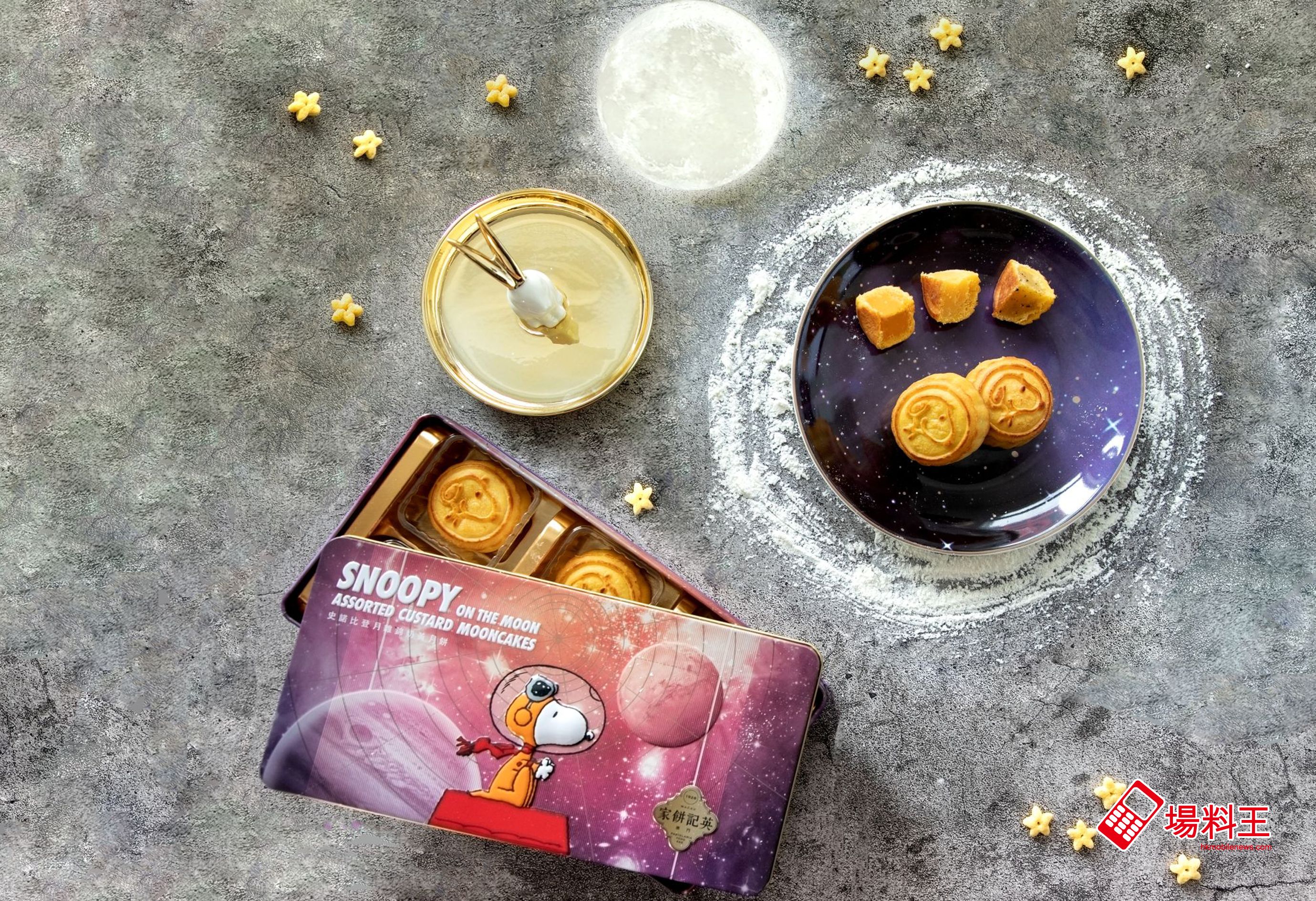 有關史諾比月餅,今次已非首次跟澳門英記餅家作聯乘合作,而今年更推出為紀念史諾比於 1969 年隨阿波羅 10 號太空船為人類登月之旅作最後準備 (正式人類登月為 2 個月後的阿波羅 11 號),故今次推出「史諾比登月雜錦奶黃」,以為登月 50 年致敬。當中備有經典奶黃、芝士奶黃,及新加入的黑松露奶黃共 3 款味道、各 2 個月餅。