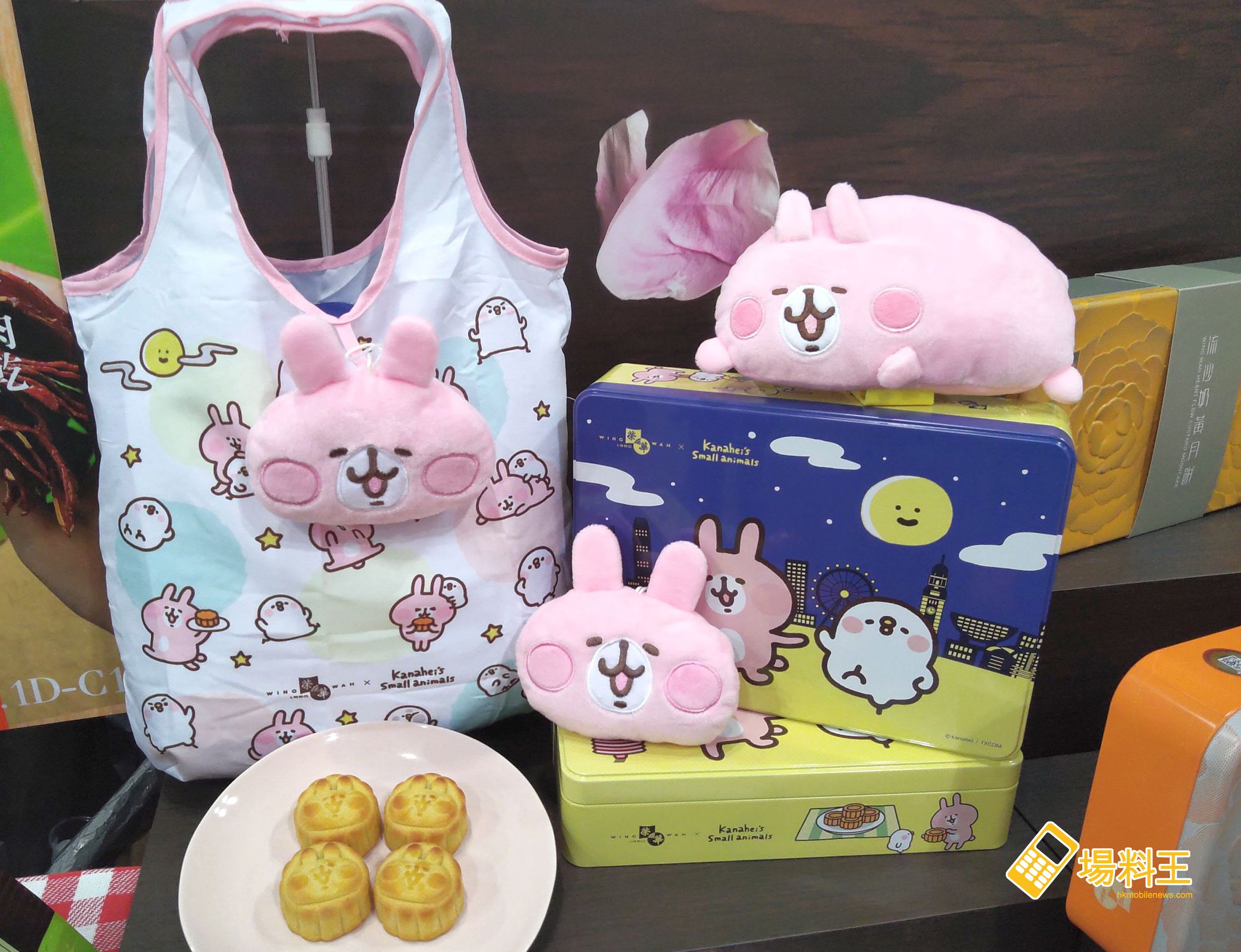 同是流沙奶黃月餅,不過榮華在外形上換上卡娜赫拉的大頭樣,在 4 個流沙奶黃月餅外,附送的贈品則換上別注版 P 助與粉紅兔兔可摺疊式環保袋,毛毛粉紅兔兔小袋兼掛飾,確係設計簡單又可愛!