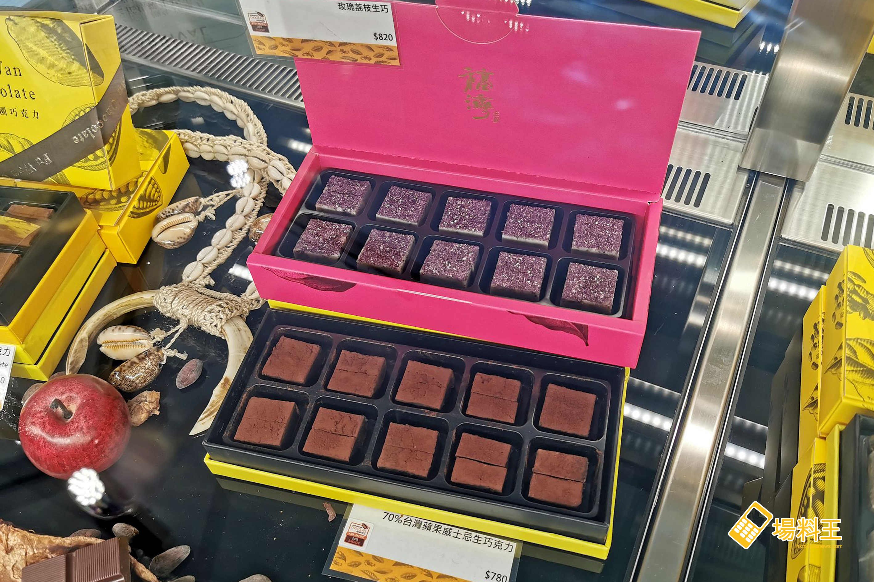 店內發售的朱古力,部分更是得獎產品,如「玫瑰荔枝朱古力」(NT$820 / 下圖上)、「蘋果威士忌70%朱古力」(NT$780)都是 ICA 世界朱古力大賽的得獎商品。