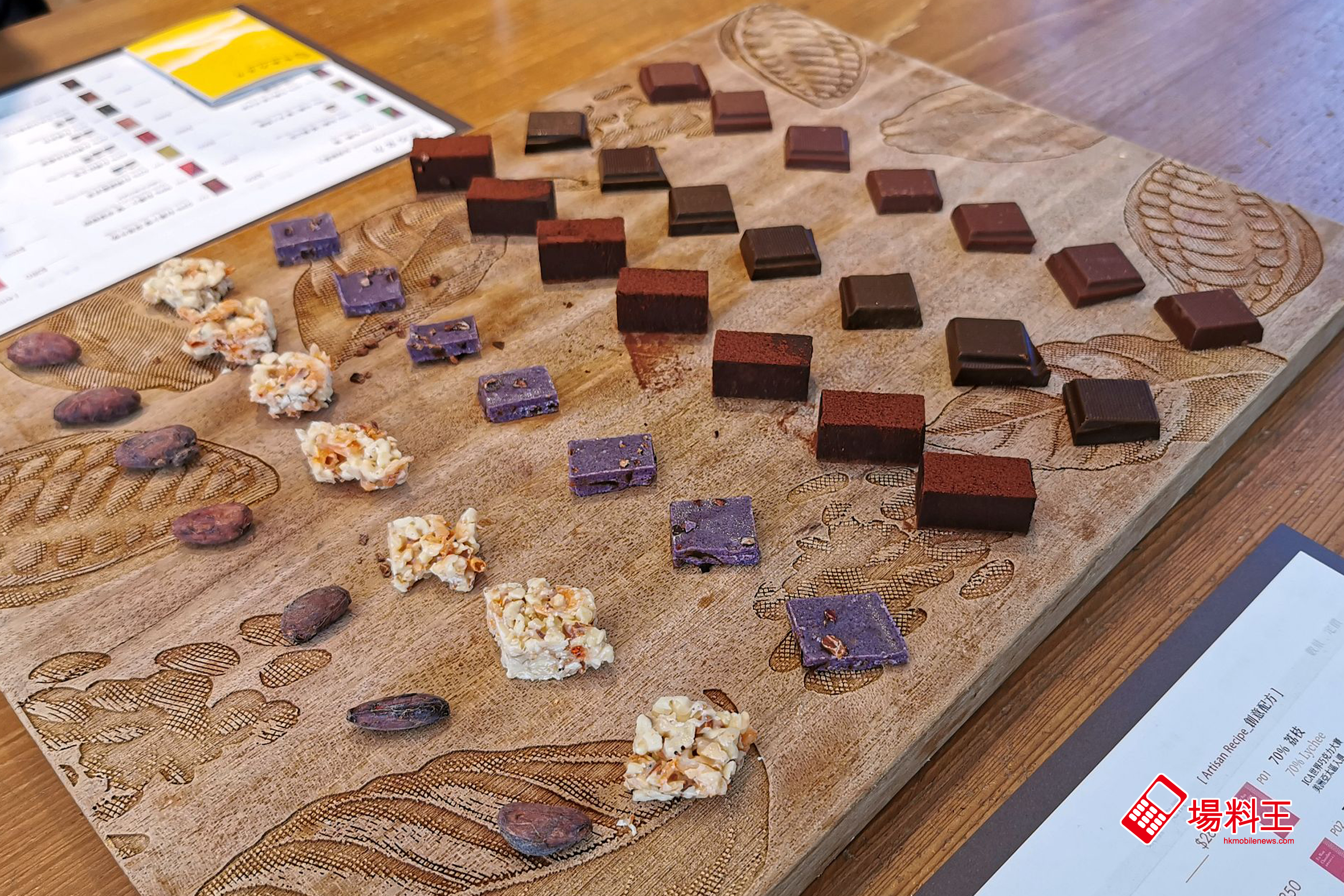 如參加附朱古力品鑑內容的導賞團,通常在逛完莊園後,最後才是試食的環節;筆者亦試吃了 6 款朱古力,下圖左起分別是莊園可可豆、櫻花蝦朱古力、玫瑰荔枝可可碎、73% 苦甜朱古力、62% 台灣炭焙烏龍茶朱古力、62% 台灣一號屏東朱古力,個人頗頗喜愛櫻花蝦朱古力、玫瑰荔枝可可碎兩款,味道特別。