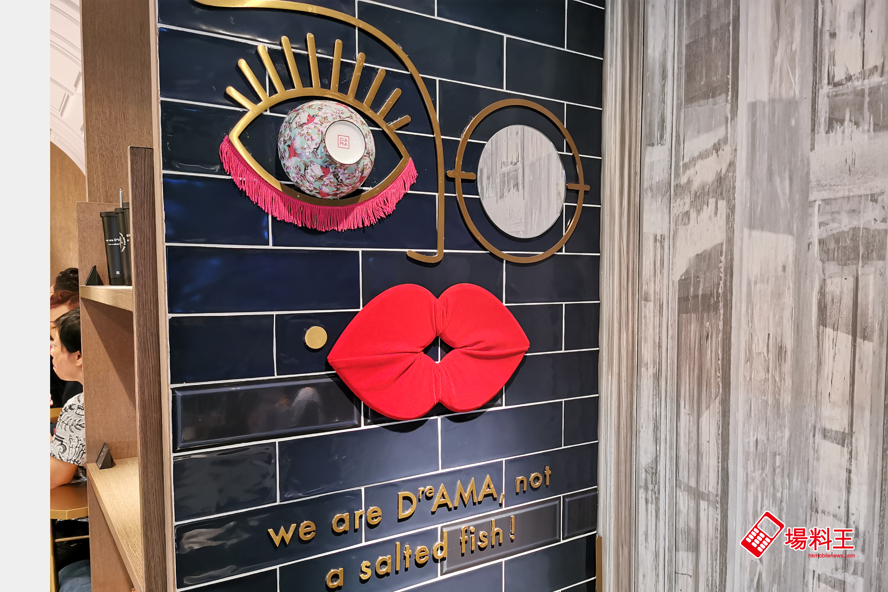 甫進 DAMA,即被右邊的黑色方格牆所吸引,原來他們著重與本土原創牌子合作,而這牆上的人面圖案,就以 ByLeona 設計的專屬別緻圖案瓷器的碗、碟作雙眼,加上兩個心拼湊出紅唇,十分搶眼,而下面更有「我是夢者,不是鹹魚」的英文創作箴言 (上圖),可說是店內的首個打卡位!據聞 DAMA 遲些更會舉行一系列的茶具、餐飲與藝術工作坊,為香港社會注入更多元、更互動、更關愛本土原創藝術文化的動力。