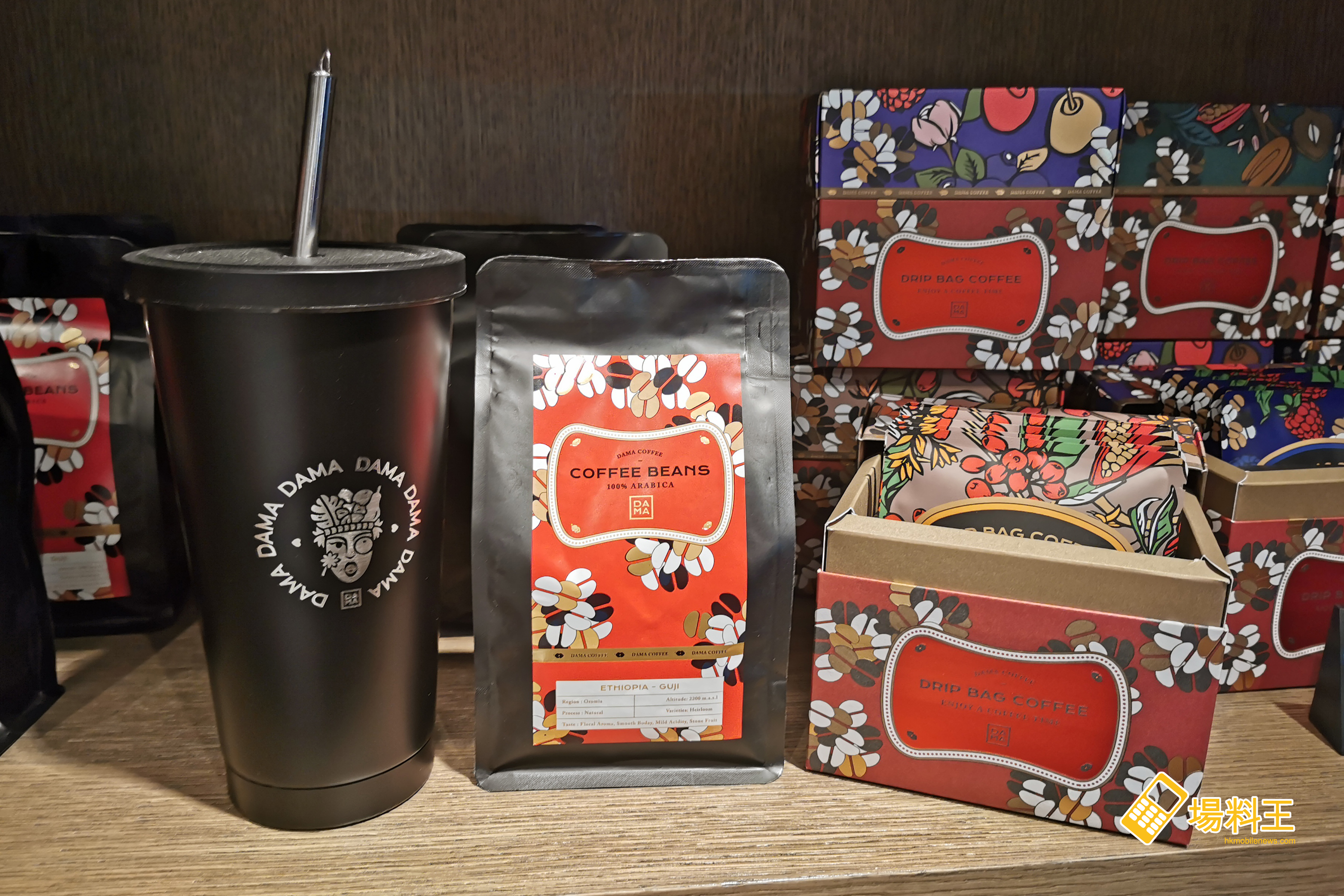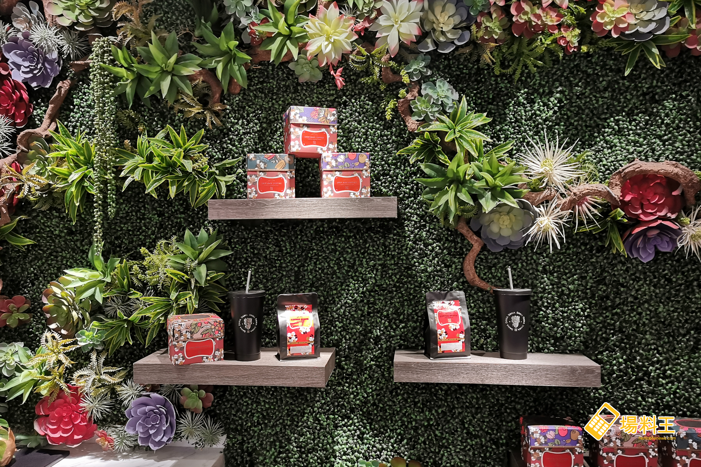 另外,雅座旁有一幅由紅花碧草綠葉堆疊而成的牆 (上圖),盡顯大自然無限生機孕育藝術的氣息,牆上放置設計優雅而創新的茶/咖啡杯和商品等,可說是店內另一個打卡熱點位置。順道一提,店內還有一些咖啡產品發售,下圖左起包括隨行咖啡杯 ($238,連咖啡或茶一杯)、咖啡豆 ($98)、咖啡掛耳包 ($120)。