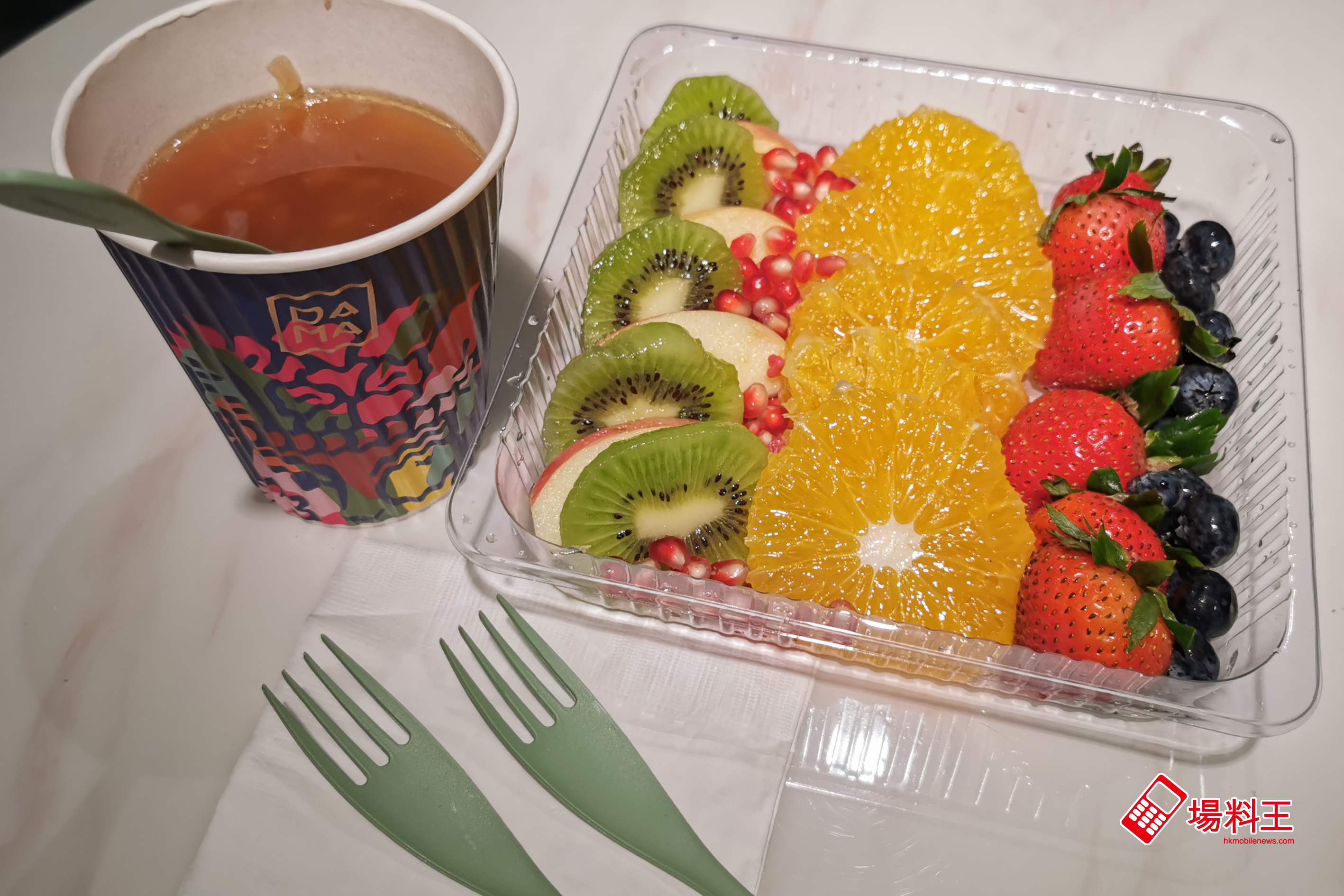 餐廳的飲料與輕食比例為 8:2,飲料除了冷壓超級果汁外,還有果茶、咖啡、熱湯等,而輕食方面則有乳酪杯、沙律、菜捲等,而午餐時間更提供午餐套餐,凡點選一份沙律或菜捲,加一款熱湯,餐價為 $88,如下圖的鮮果沙律 ($58) 配低脂、高纖維的紅菜頭湯 ($38) 便是,且餐具也是可循環多次使用的,完全符合環保要求。