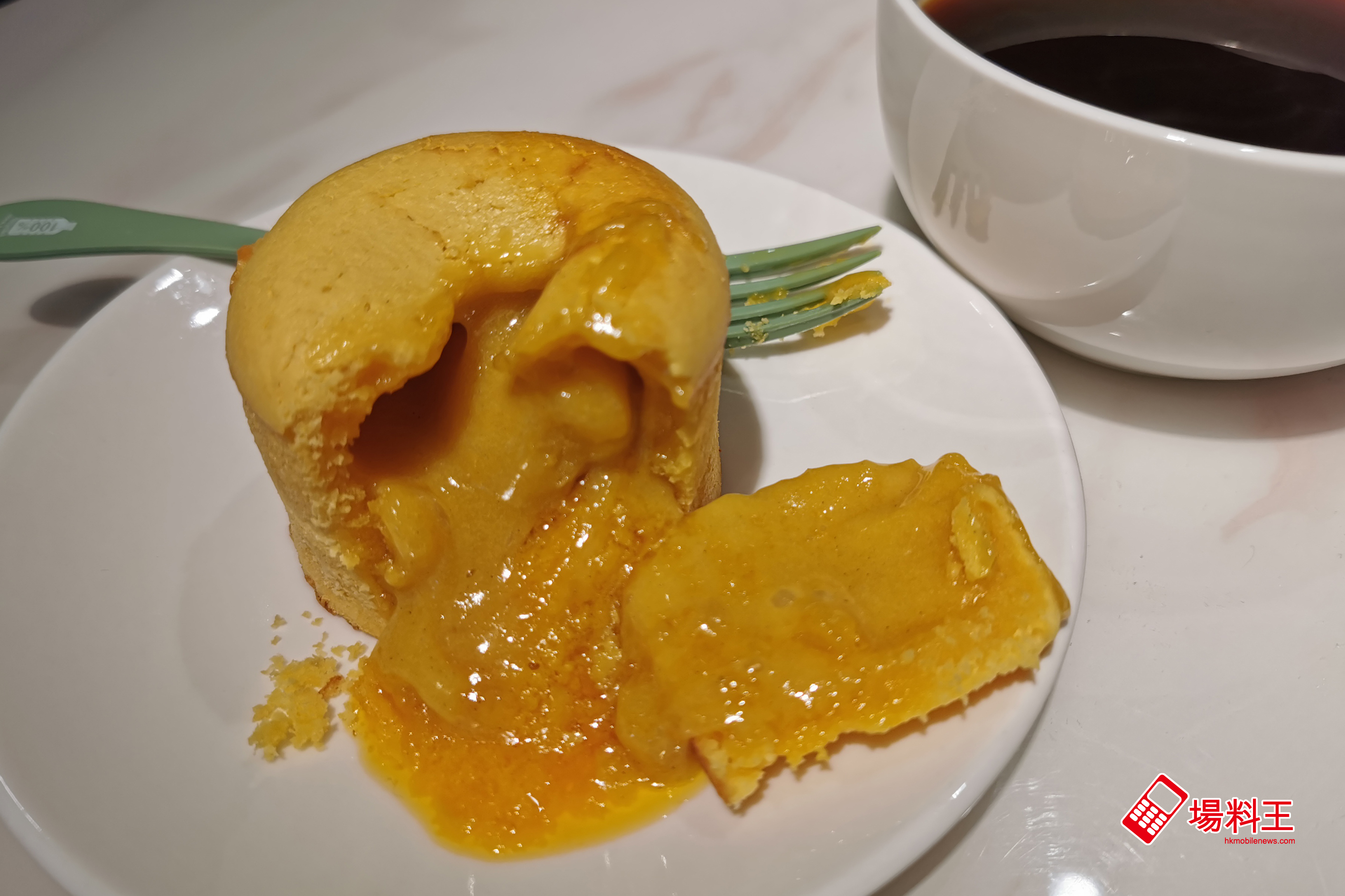 至於下午茶時間亦有套餐提供,分別是揀選一款小食 ($68)、一款蛋糕 ($72、$98),再配咖啡或茶。如下圖的鹹蛋黃流心蛋糕 ($42) 連一杯美式咖啡 ($38),合共只需 $72,而且鹹蛋黃流心蛋糕的鹹蛋黃味道不太過濃,就算放一會後才入開仍有流心效果,算是今次試吃的另一驚喜。