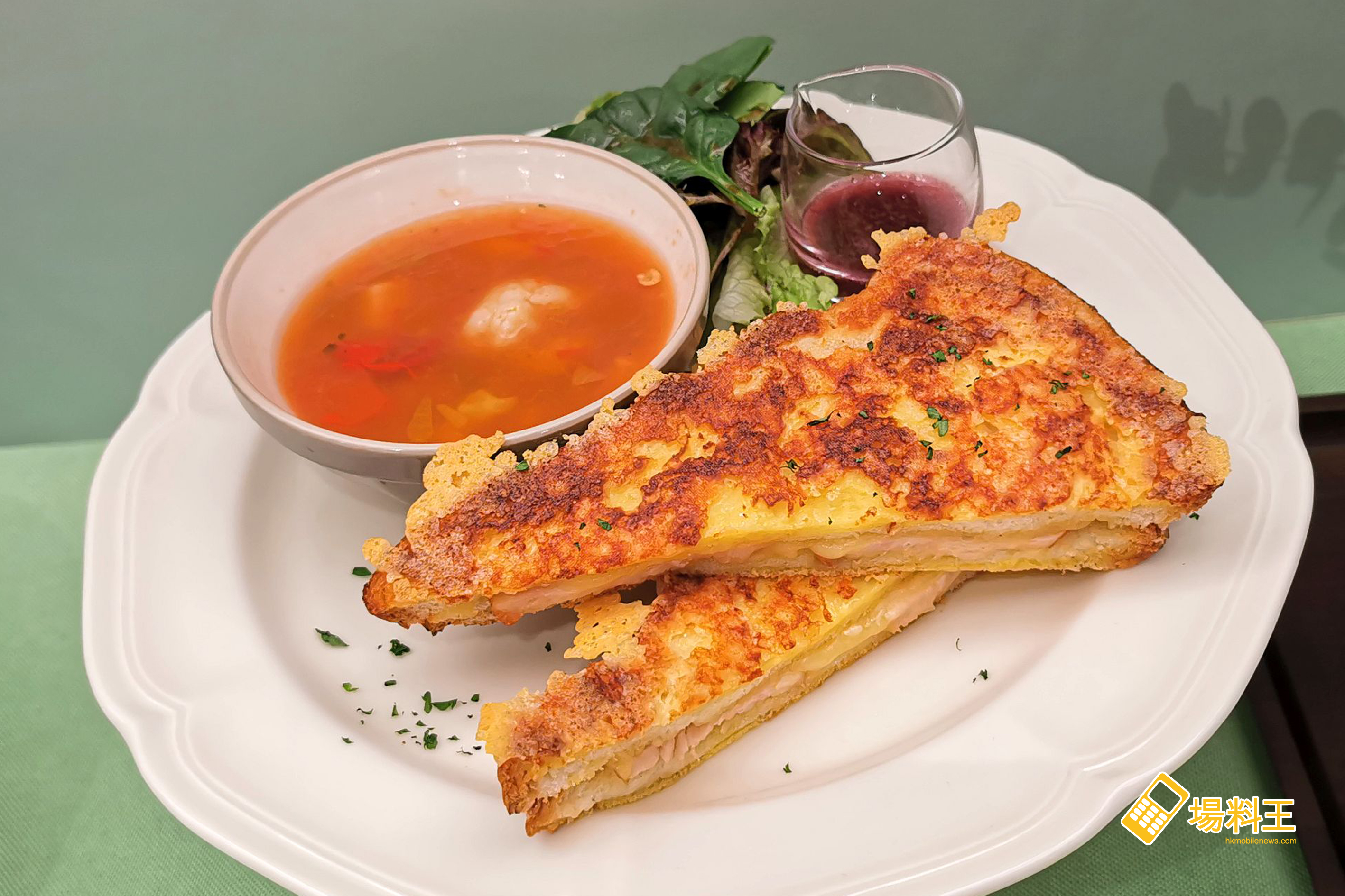 主食現時大約提供 6 款,除了上文的烤鴨胸外,筆者朋友點了以法式多士夾著 Gouda cheese、Parmesan cheese 烘烤出來的「French Toast Sandwich with Smoked Chicken and 2 kinds of Cheese」($108/套餐 $138),芝士香氣十足,且即使單點也會附送羅宋湯,是不錯的輕食之選。