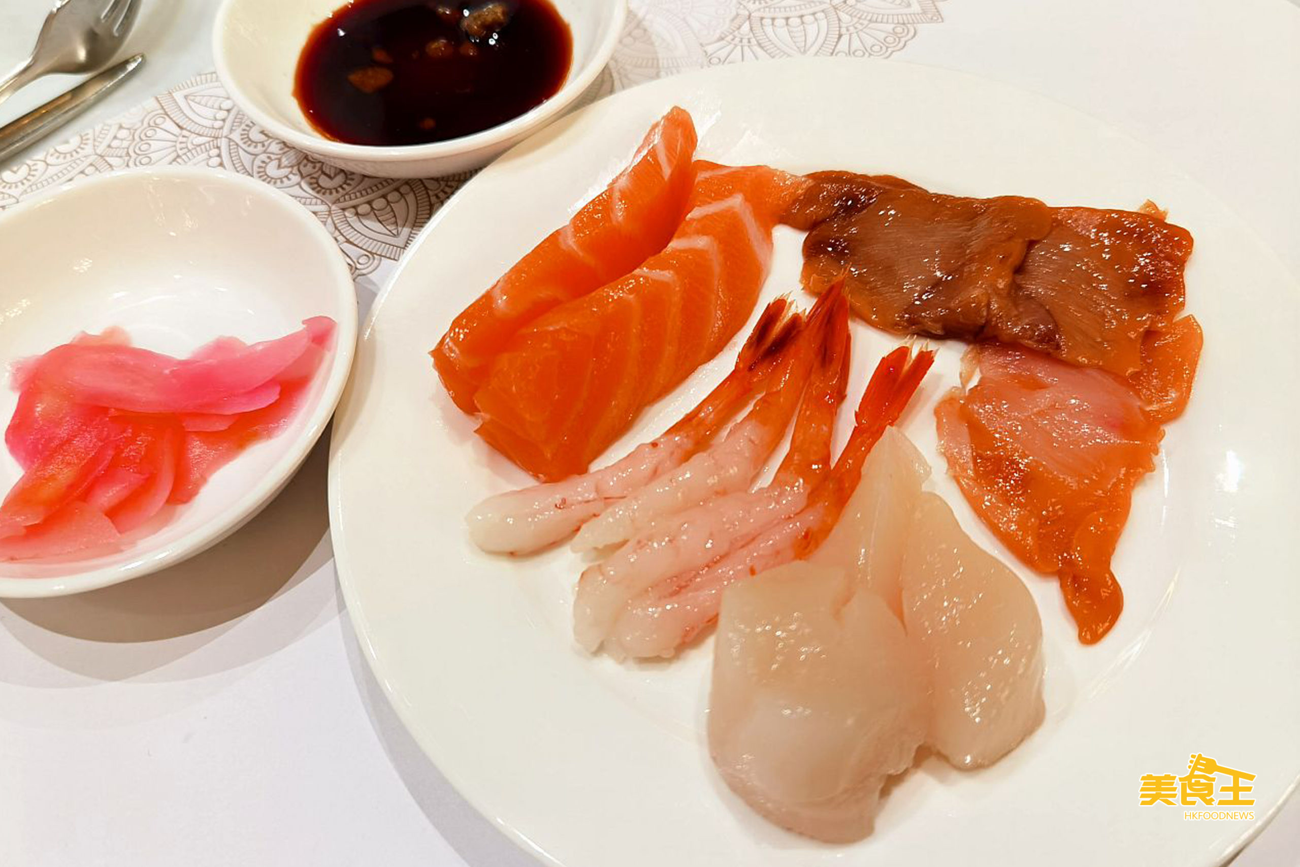 刺身方面有三文魚、吞拿魚、鯛魚、油甘魚、甜蝦、帶子、赤貝等。