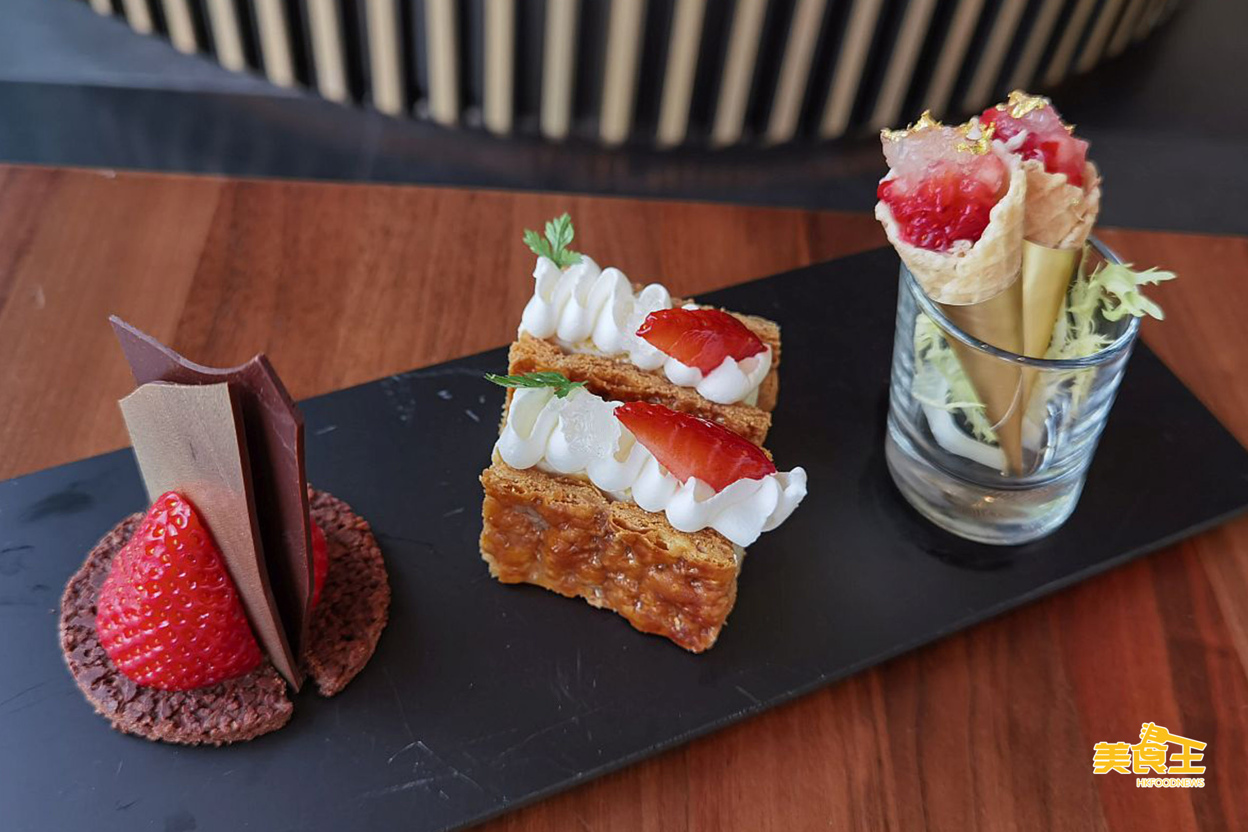 甜點方面,先有上圖放於「福岡甜王士多啤梨燕窩蟹肉甜筒」旁的「福岡甜王士多啤梨釀燕窩及白朱古力」(上上圖左) 及以香脆酥皮襯托芝士蛋糕的「福岡甜王士多啤梨燕窩芝士蛋糕」(上上圖中),甜而不膩。