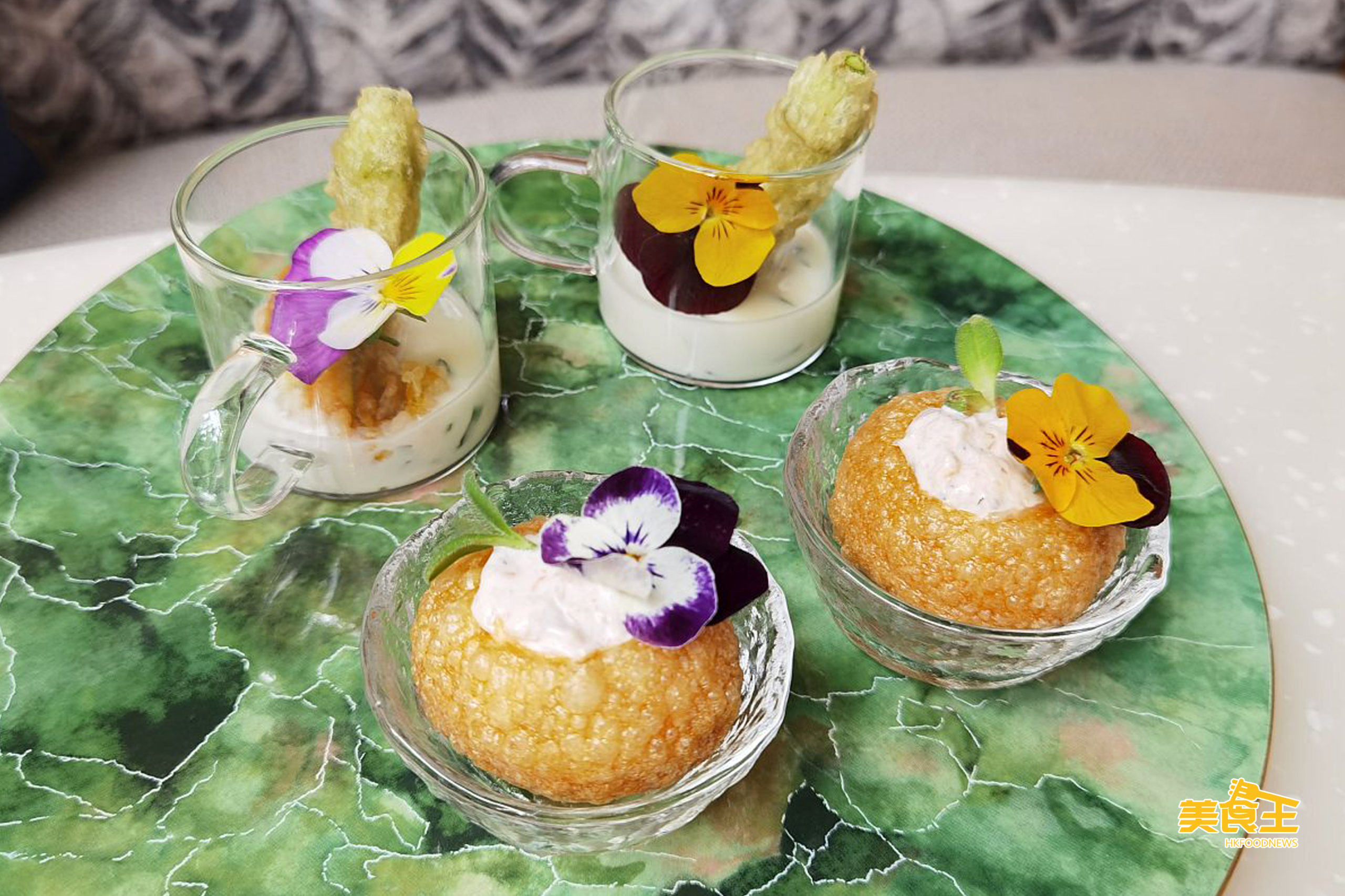 鹹點方面可先試先脆口感的「蟹肉沙葛栗米脆球餅」(下圖前)、「芝士芫茜釀南瓜花」(下圖後)。