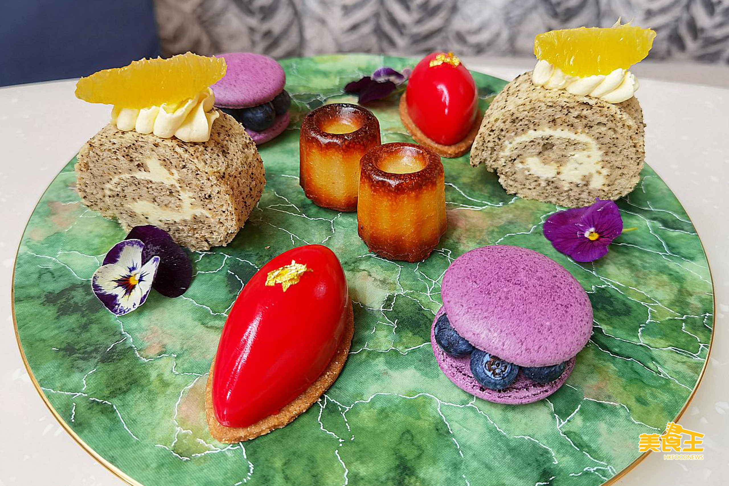 甜點的用色也很搶眼,特別是用上紅色及金箔的「玫瑰荔枝慕絲蛋糕」(下圖前);「藍莓馬卡龍」(下圖右) 則因夾著藍莓故入口不像一般馬卡龍般常有的太甜情況,值得一讚;頂端放有橙片的「伯爵茶香橙蛋糕」(下圖左) 入口鬆軟且具微香茶味;至於法式糕點的「蜜糖可麗露」(下圖中) 其焦糖的微硬外殼讓口感添上一分焦香。