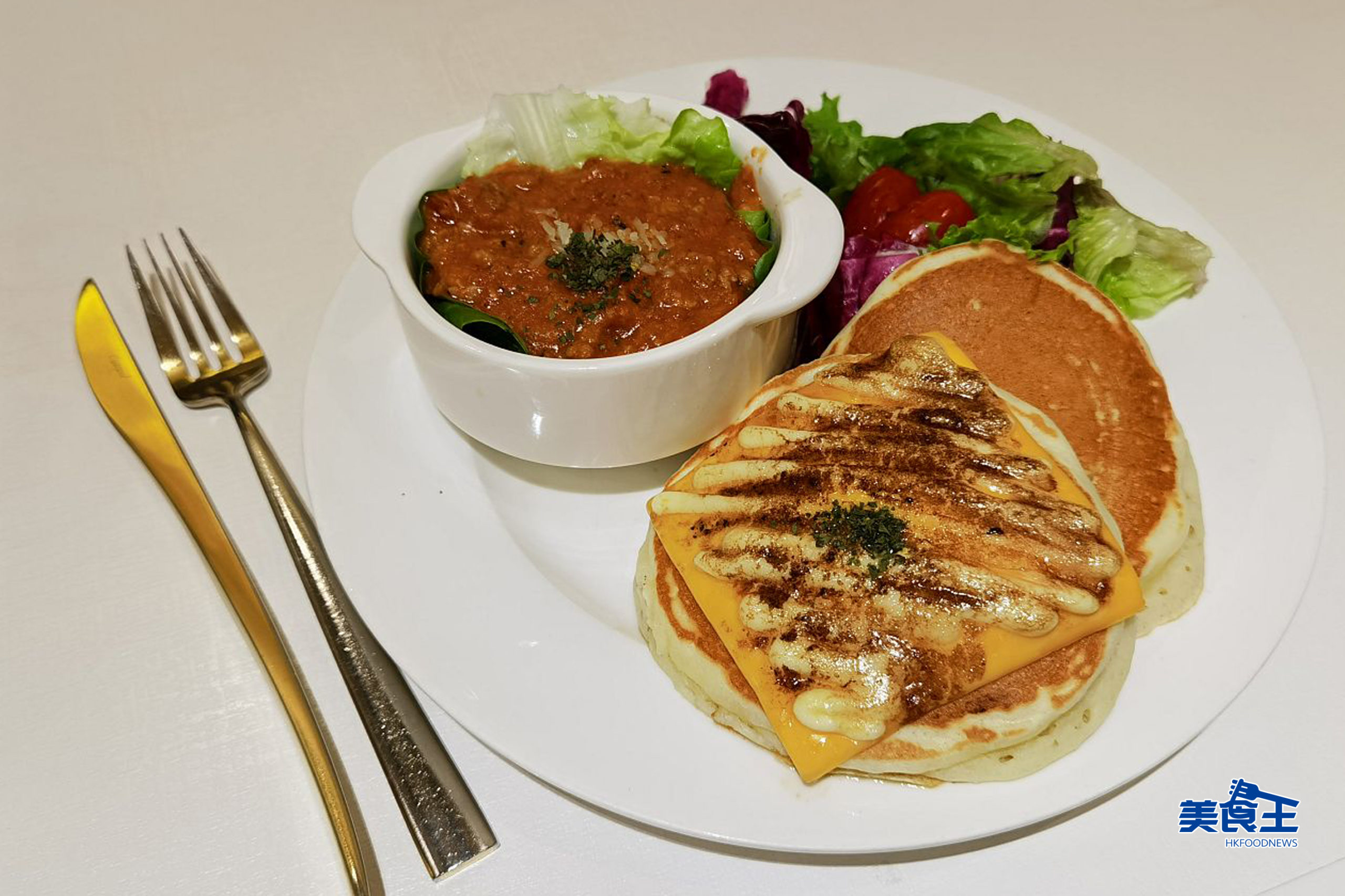 品牌的 Pancake 以優質日本麵粉、3.6 鮮牛乳配以手製技術製成,質感、口感也份外鬆軟,今次的 Bolognese Cheese Pancake ($98) 配上意式蕃茄肉醬、面層燒香的車打芝士,再伴以鮮沙律,看似簡單,但咸香惹味的蕃茄肉醬、焦香的芝士跟鬆軟的 Pancake,卻很匹配!
