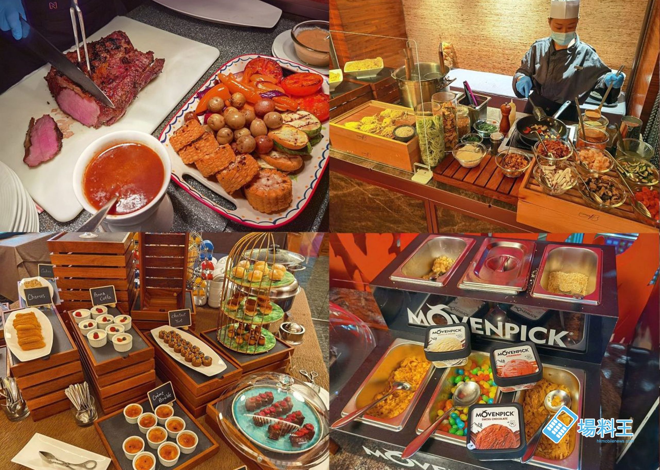 其他美食,除了常見的中西美食、即烤牛肉等以外,還有自選多款自選如龍蝦、帶子等海鮮配料交專人即場烹調的意粉或中式麵食。甜品方面亦有約廿款選擇,並常設 3-4 款 Movenpick 雪糕,可滿足不同喜好的食客需求。