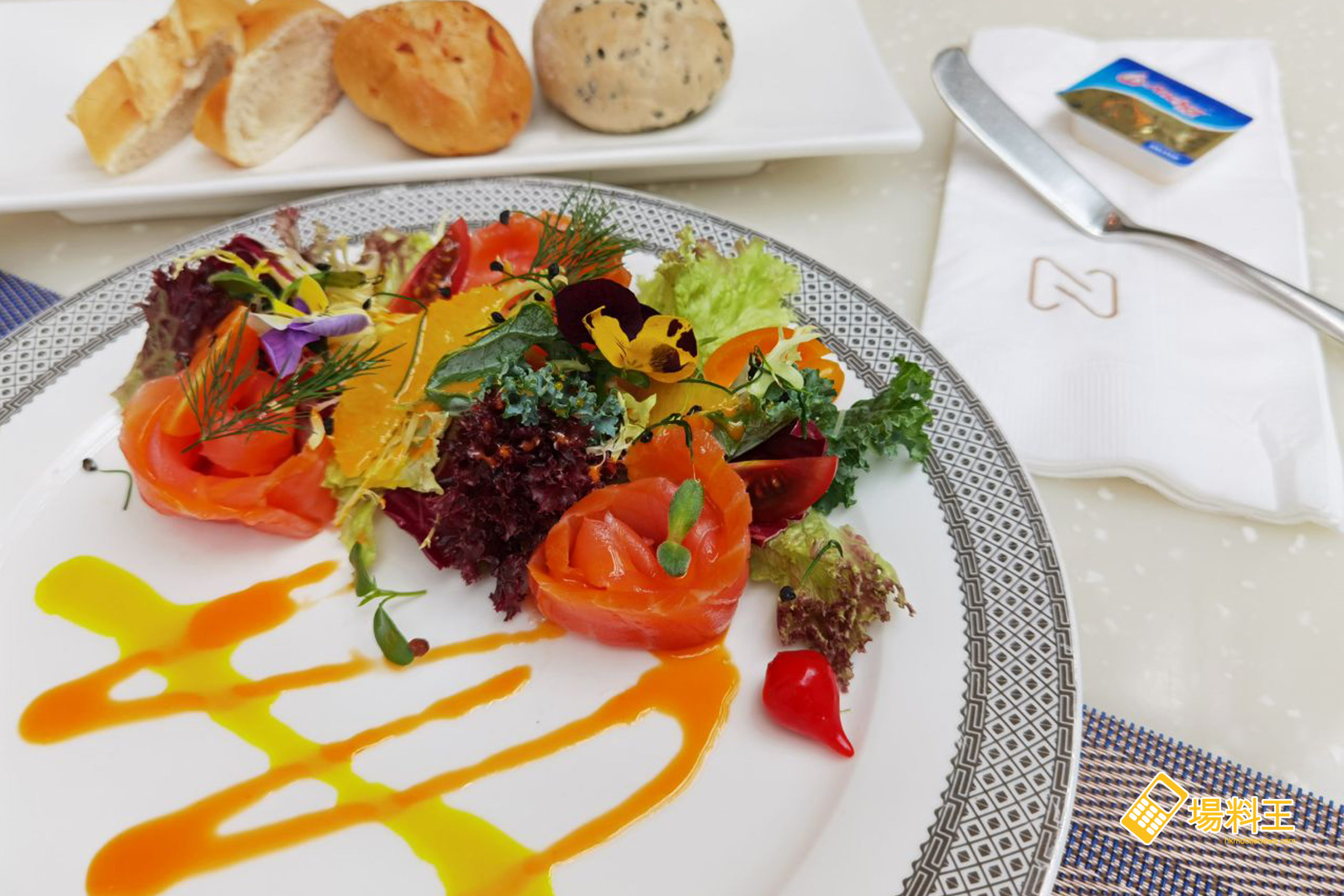 筆者選擇了的是「煙三文魚田園沙律配香檸油醋汁」前菜,並額外加 $38 把餐湯升級作餐廳招牌菜之一的「龍蝦濃湯」,主菜方面則是「炭燒美國肉眼扒配火箭菜沙律」。