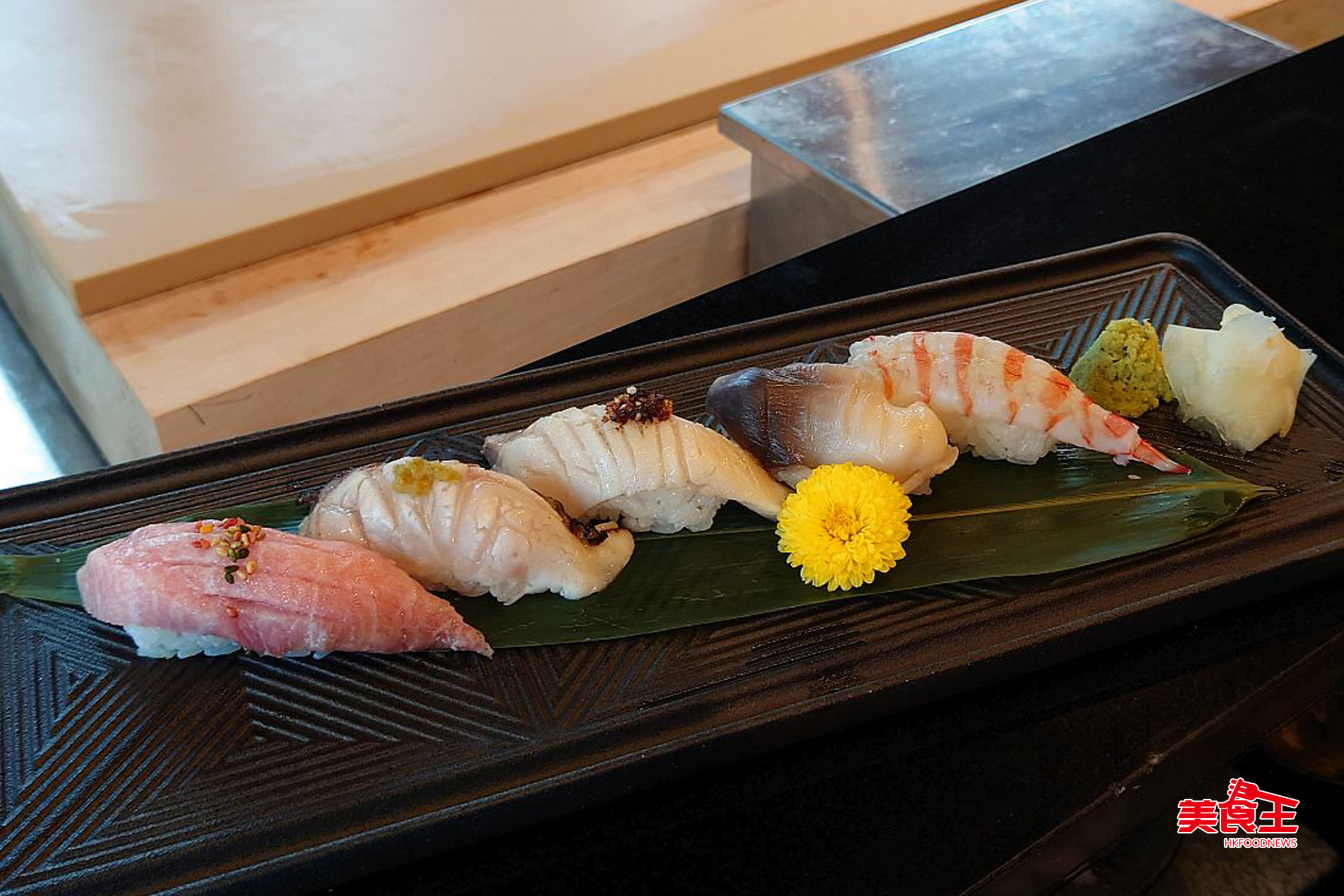 B 師傅嚴選日本各地的海產製作手握壽司,筆者試吃了由吞拿魚、黑木魚、刺身級銀鱈魚、鮮北寄貝及花竹蝦製成的壽司,味道各有千秋。