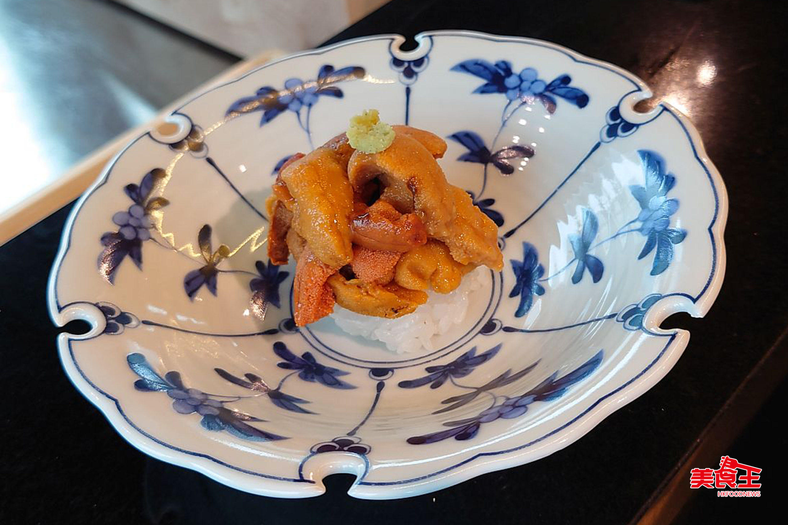 深橙色的馬糞海膽,鮮甜味美,主廚用料十足,用來製作壽司,份量比下面的醋飯還要多,吃下去令人有超滿足的口感!