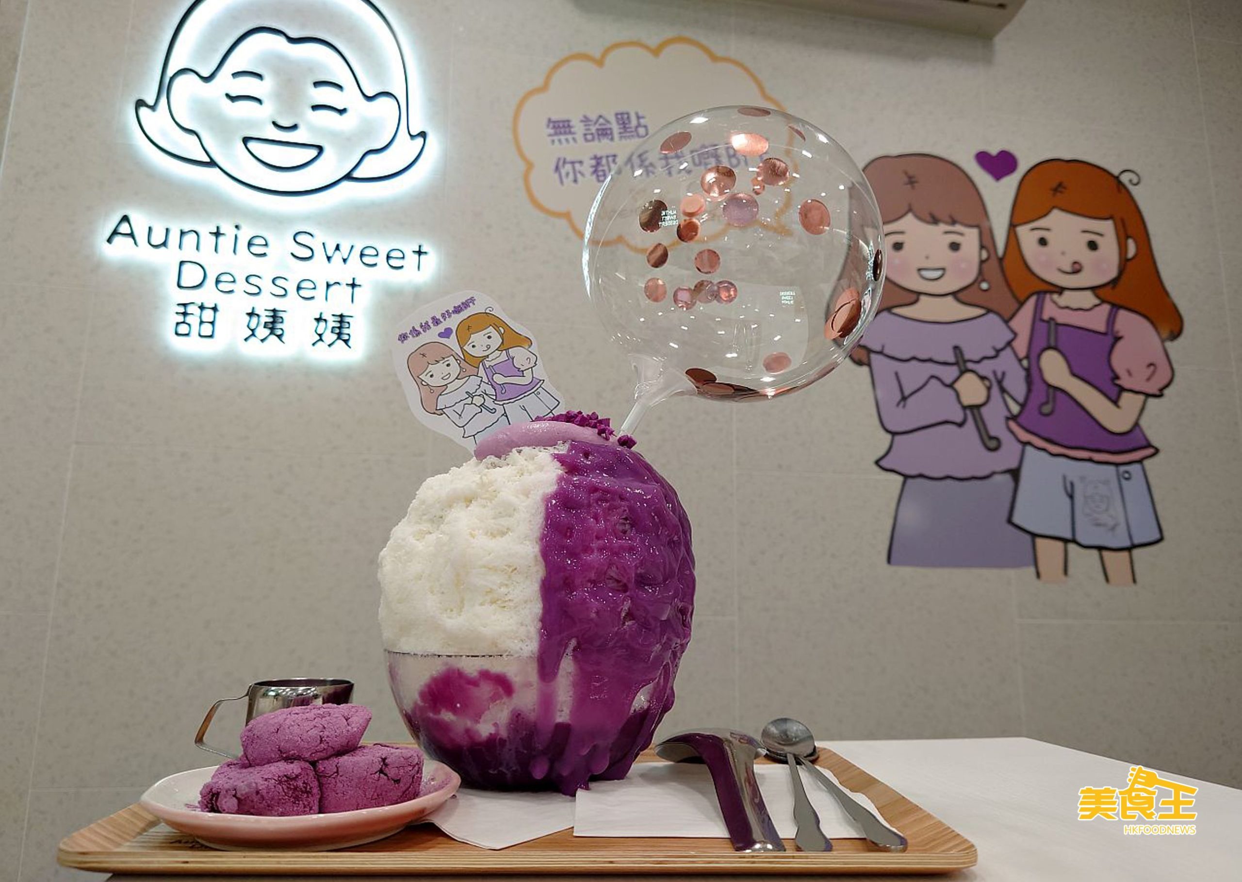 位於天后及銅鑼灣都有甜品店的甜姨姨,一向以用料十足、製作認真而贏得不少食客捧場,最近品牌更跟香港插畫師「阿祖 Joeie」搞聯乘合作,推出「好紫妹」的 2 款甜品系列,分別為「紫薯牛奶刨冰」(本文主相)、「紫薯麻糬吐司」;甜姨姨更特別訂製了粉色系水晶汽球,令其打卡度大大提升,人見人愛,並配上阿祖的語句插卡,讓大家可寫下心情或分享的樂事,一舉多得!