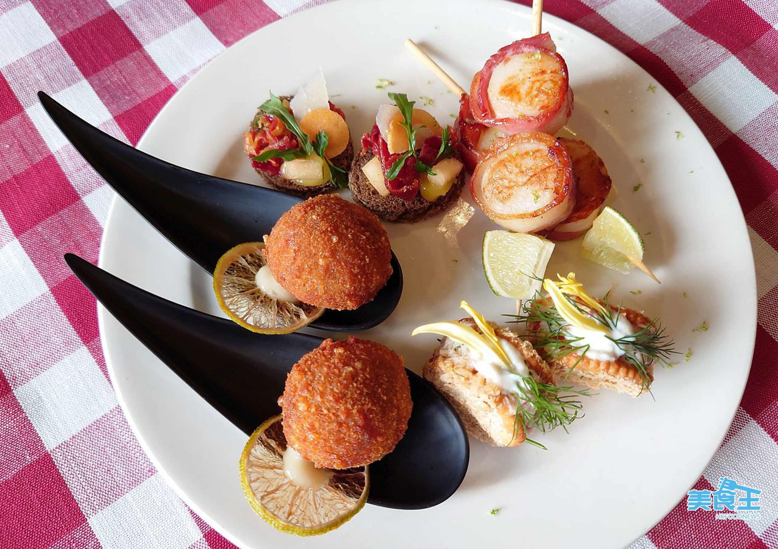 「雛菊香檸下午茶套餐」提供鹹食及甜點各 4 件,先有「吉列和牛芝士波配咸青檸蛋黃醬」(下圖左前)、「西班牙火腿配檸檬果醬」(下圖左後)、「柚子蕃茄蟹肉燕麥脆餅」(下圖右前)、「北海道帶子煙肉串配檸檬海鹽」(下圖右後),賣相精緻,且廚師用上乾果、檸檬等去中和了咸點的油膩感。