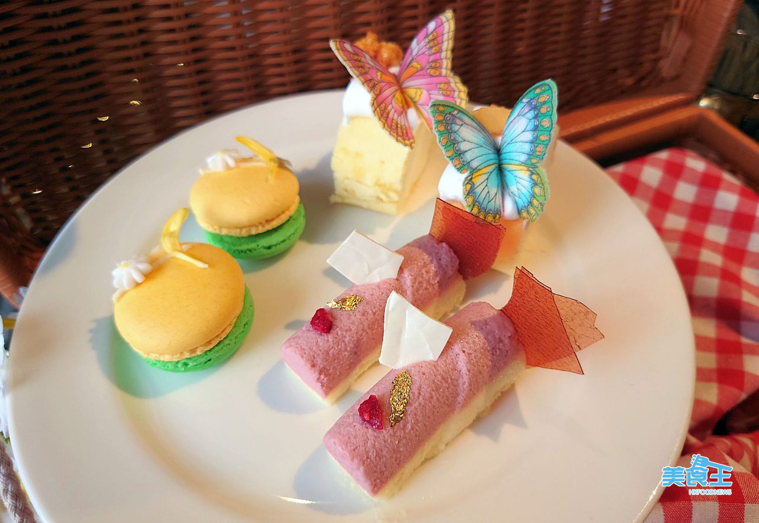 甜點方面則有「佛手柑紅桑子慕絲蛋糕」(下圖右)、「雛菊蜜糖馬卡龍」(下圖左)、「白朱古力青檸慕絲卷蛋」(下圖後),味美且不過甜之外,當中還分別以金薄、食用花、蝴蝶米紙作裝飾,好睇又好食,確是打卡呃 Like 之選!
