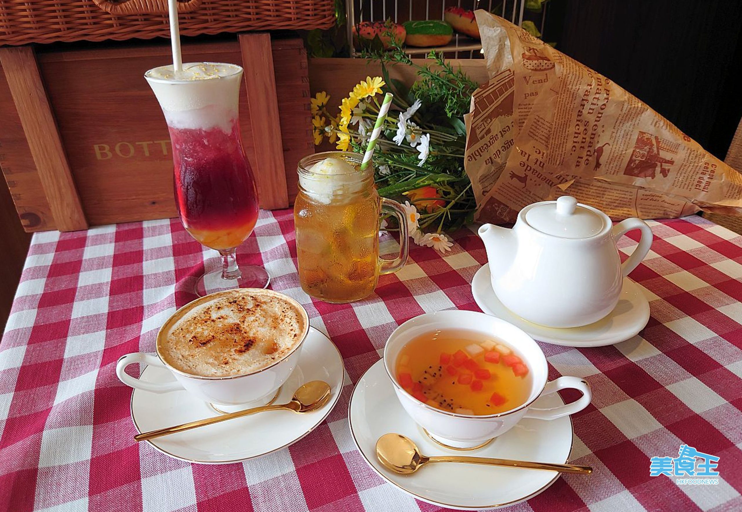 配餐亦有 4 款特飲供選擇,熱飲有「焦糖布丁鮮奶咖啡」(下圖左前)、「雛菊蜂蜜」(下圖右前);凍飲則有「柑橘冰茶」(下圖左後)、「冰極洋甘菊特飲」(下圖右後),筆者覺得味帶酸甜的「冰極洋甘菊特飲」最醒胃,用來配甜點亦對味。
