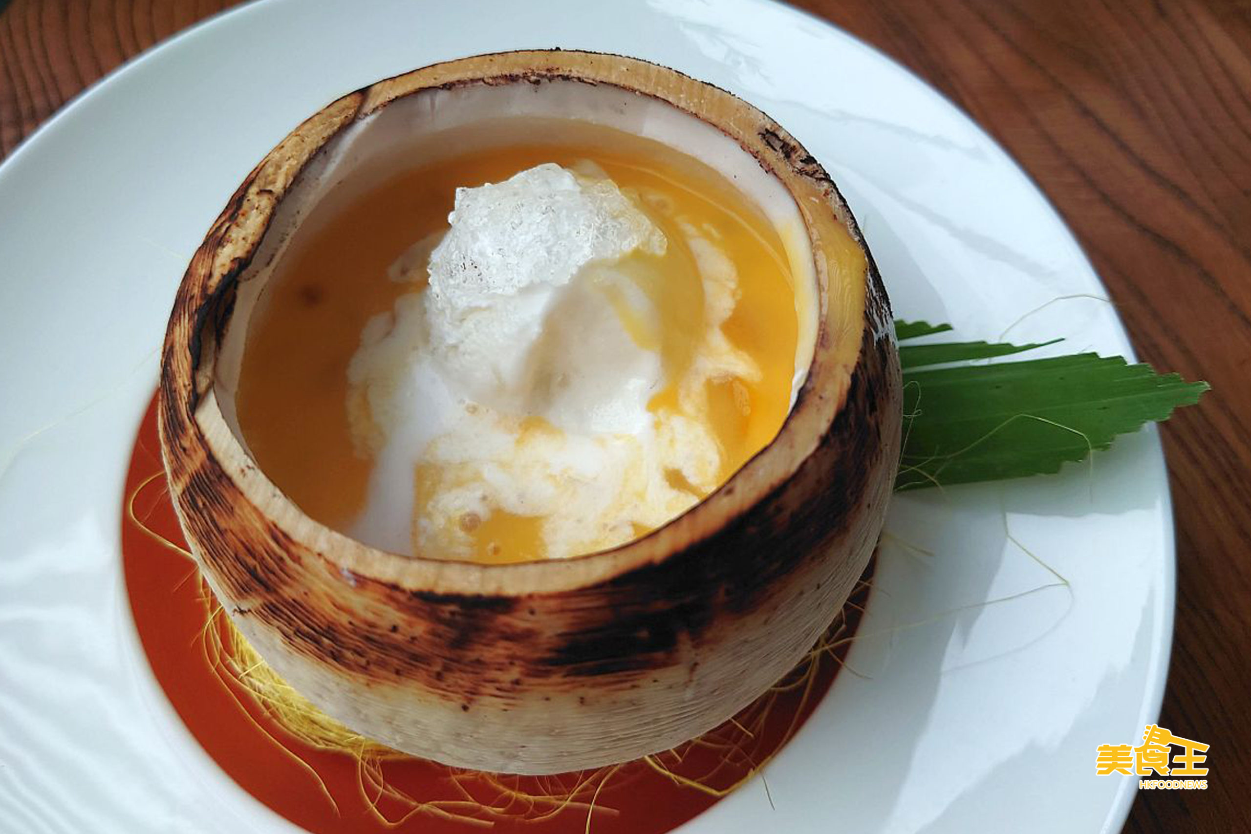 餐後來個張師傅獲獎的自創甜品「原個雪燕香芒椰子盅」($88),以鮮椰皇內放椰肉果凍、菲律賓芒果、椰子雪糕,三重口感香甜味美。