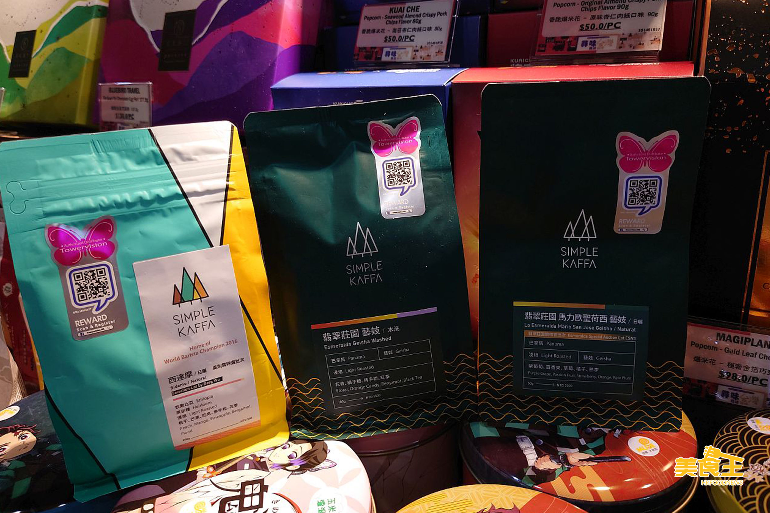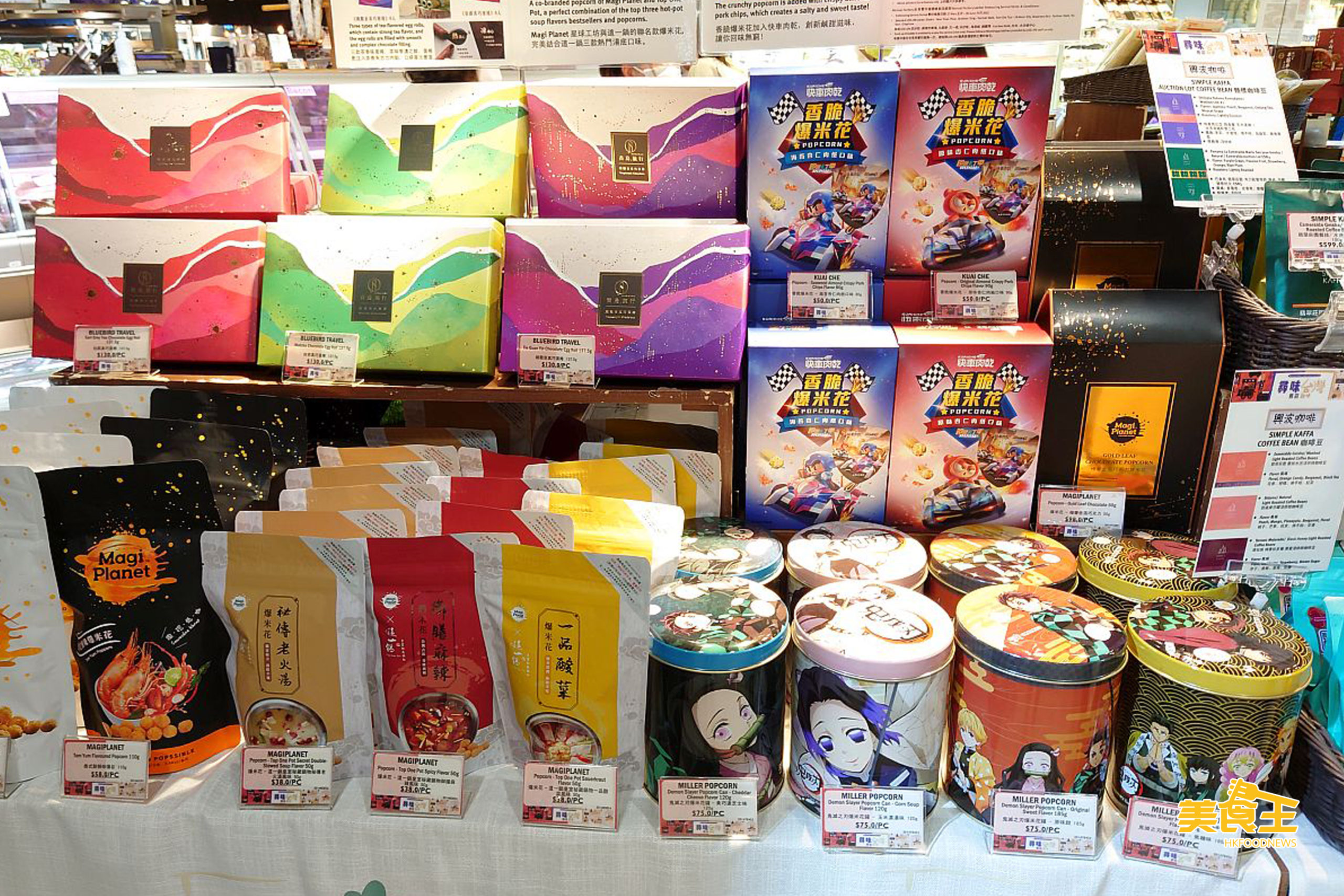近年台灣大熱的「星球工坊」跟「這一鍋皇室秘藏鍋物」首次聯乘的御膳麻辣、一品酸菜風味的爆米花 ($38 / 下圖中前);「青鳥旅行」的多款口味蛋捲 ($130 / 下圖左上)、鬼滅之刃的多款口味爆米花罐 ($75 / 下圖右前) 亦有售。
