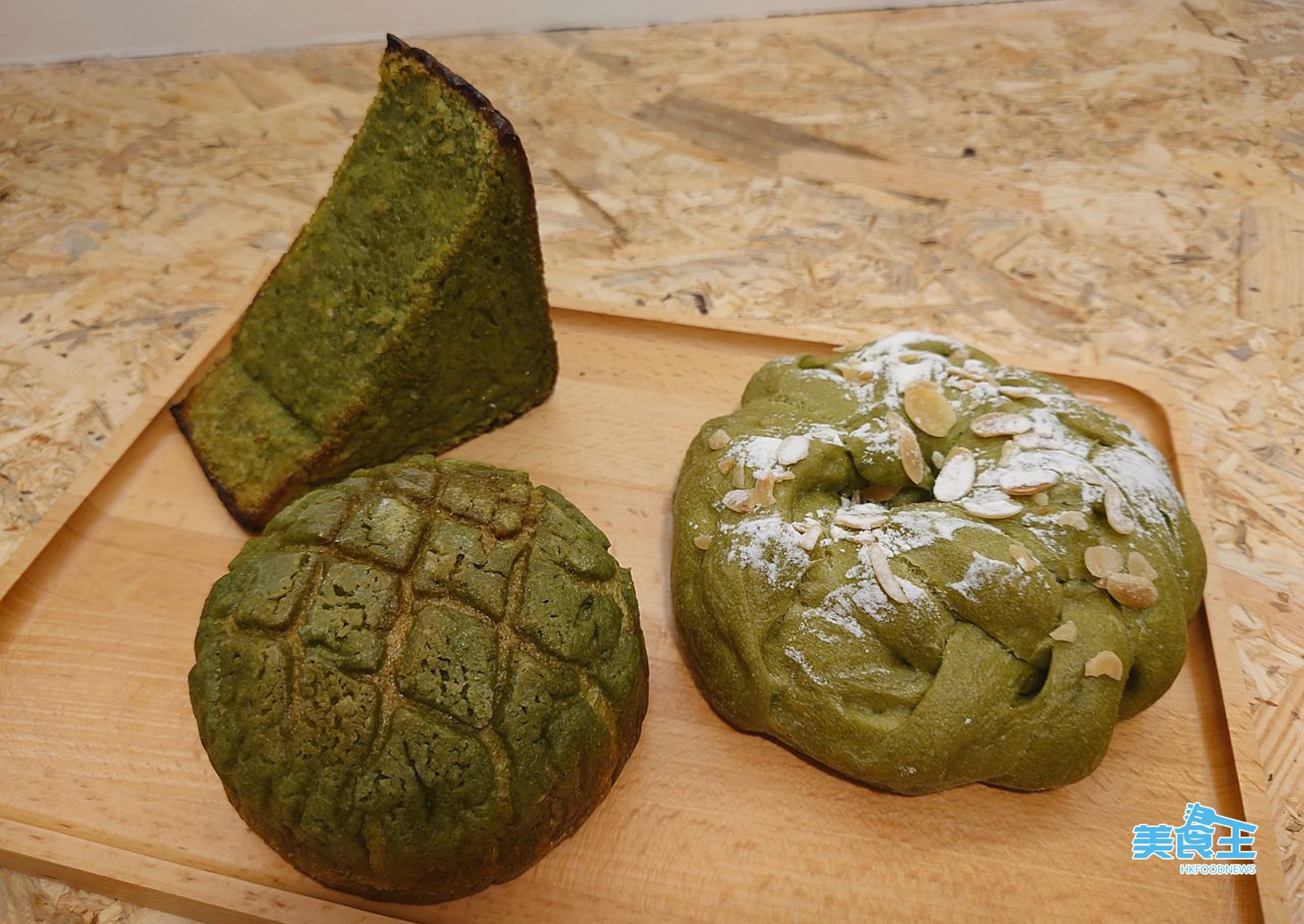 5 款「小山園抹茶系列」的鬆軟麵包各有特色,包括以手工特製的鬆脆小山園抹茶菠蘿皮的「抹茶菠蘿包」($15 / 下圖左)、加入酸甜開胃的手工煮製蘋果醬做的「抹茶蘋果軟歐」($28 / 下圖右)、外有一層焦糖和抹茶醬且口感外脆內軟的「抹茶甜心三角」($18 / 下圖後」。