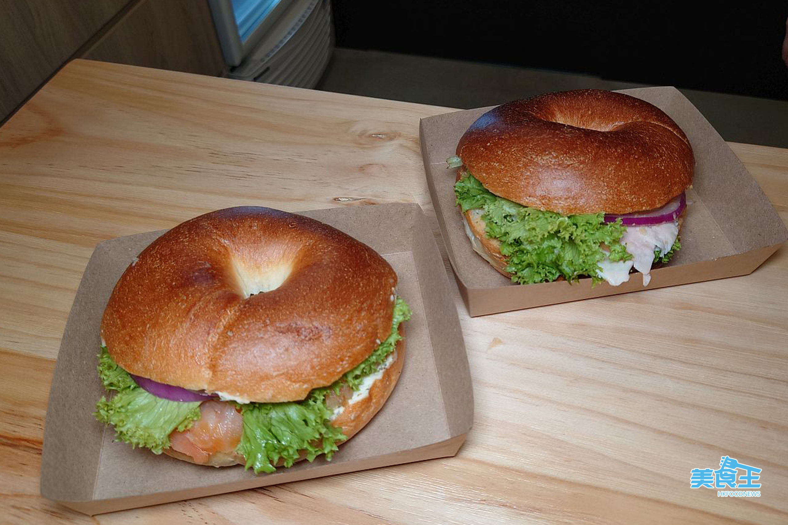 店內還提供手作餡料及天然酵母製作的「嚐麥手作」三文治系列,如「煙燻三文魚貝果三文治」($35 / 下圖左)、「鷹咀豆燻雞肉貝果三文治」($35 / 下圖右) 都是不錯之選;配上特選 100% 阿拉比卡咖啡豆,經由本地新鮮烘焙而成香口咖啡 ($22-26),即享悠閒時光。