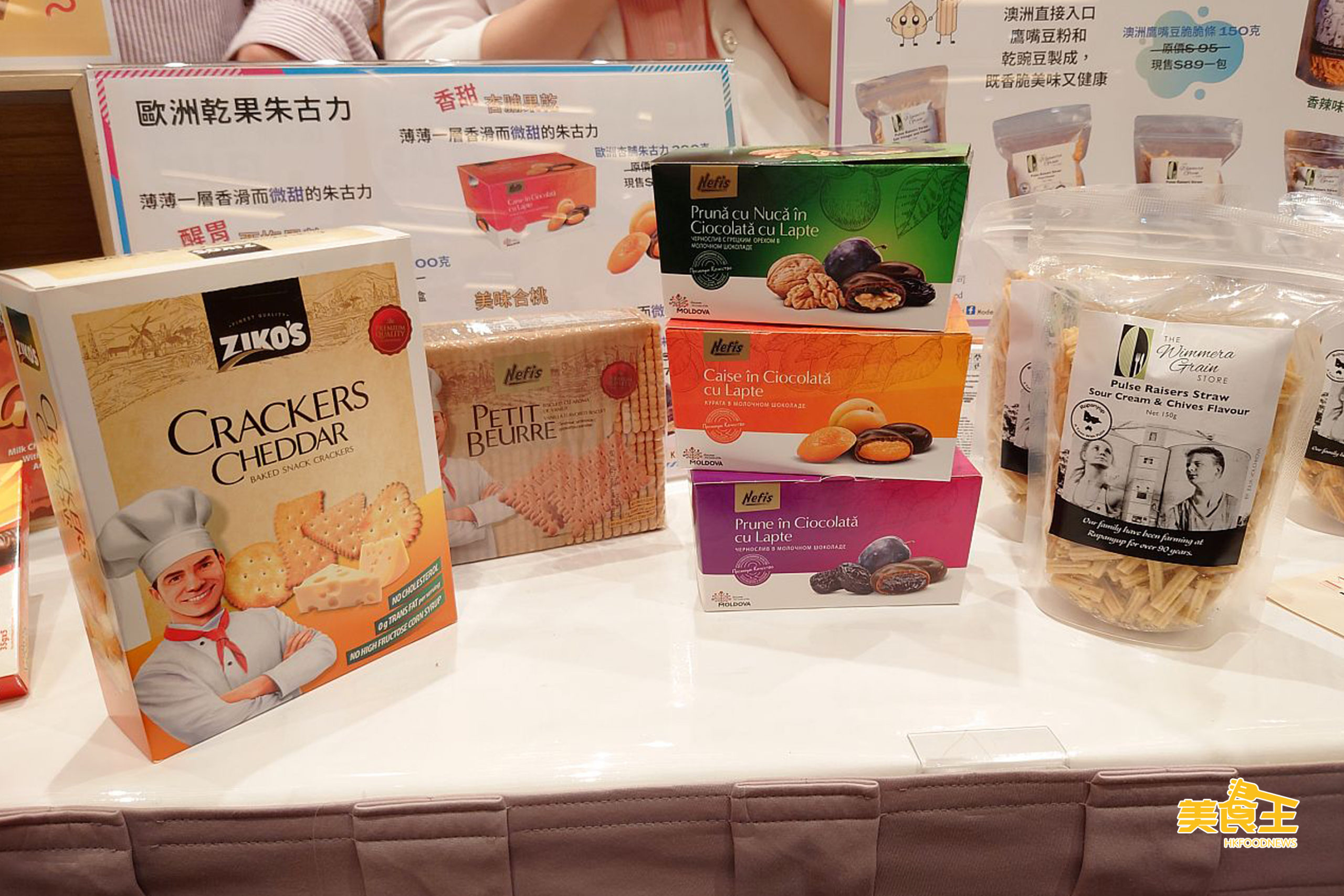 於去年年底,Modern Link (展位:3C-A04) 把歐洲及澳洲的健康食品帶來香港,今次算是首次在美食展跟大家見面。如歐洲的小食有零膽固醇的「芝士味餅乾」(下圖左)、「雲呢拿味茶餅」(下圖左二)、3 款加入合桃西梅、西梅、杏脯的「乾果朱古力」(各 $75,原價 $88 / 下圖右二);以及來自澳洲以鷹咀豆製成的 5 款味道「高纖維脆脆條」(各 $89,原價 $95 / 下圖右)。