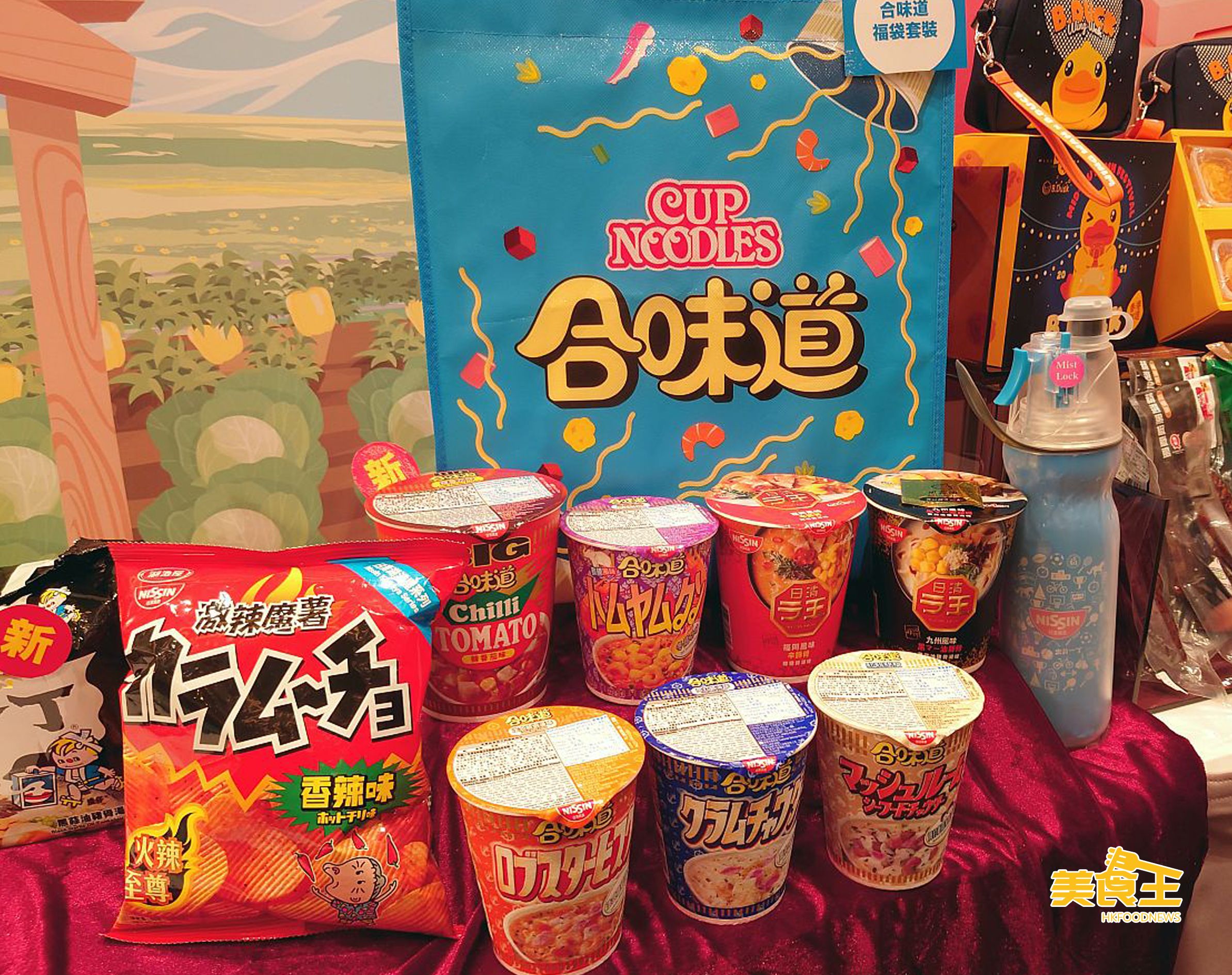 日清 (展位:1D-D02) 每年都有在美食博覽推出優惠「福袋套裝」,今年亦不例外,分別提供「出前一丁」、「合味道」推出「福袋套裝」($90 / 下圖),當中筆者較喜歡後者,因當中除了有 6 款不同味道的正常大小杯麵外,更有 1 款大杯裝新蕃茄味杯麵,並加送環保購物袋及運動噴霧式水樽,實用又美味。