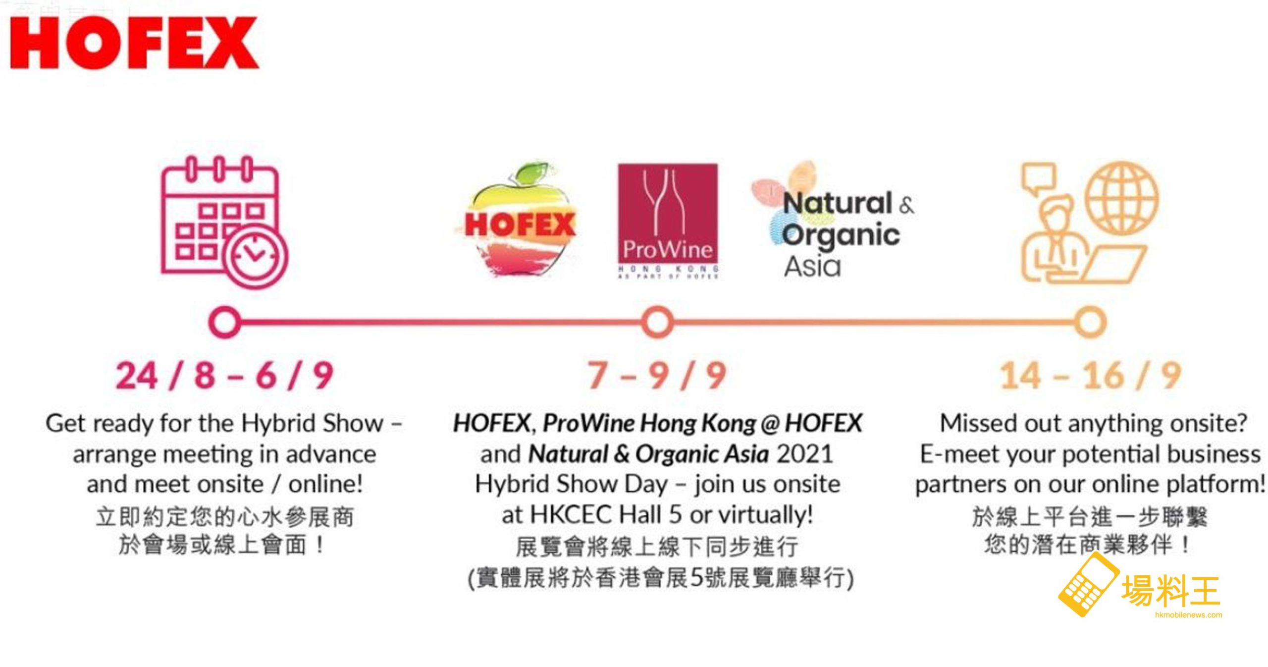 HOFEX 2021、第 19 屆亞洲頂尖國際食品餐飲及酒店設備展致力呈獻環球上乘美食、高級飲料、頂尖款待設備,並帶來最新趨勢及創新靈感。另為確保海外專才不受旅遊限制影響,HOFEX、國際葡萄酒與烈酒貿易展覽會及亞洲天然及有機博覽將首次採用線上線下並行模式,結合線上商貿配對服務及實體貿易展,提供無縫的線上線下展會體驗,買家更可於線上平台觀看精選活動的現場直播,並隨時隨地使用電子設備觀看重播!