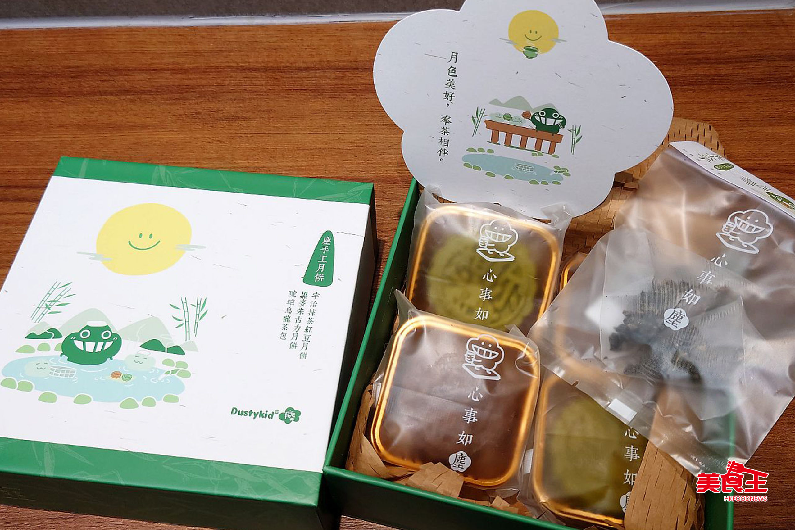 Dustykid「月色美好月餅禮盒」($178),內有 100% 人手製作香港製造、無添加防腐劑 及適合蛋奶素人士的「日本宇治丸久小山園抹茶紅豆月餅」、「比利時黑麥朱古力月餅」各 2 件,在月餅上可見到 Dustykid 的盈盈笑意及「想你」二字,已令人未吃心先甜。
