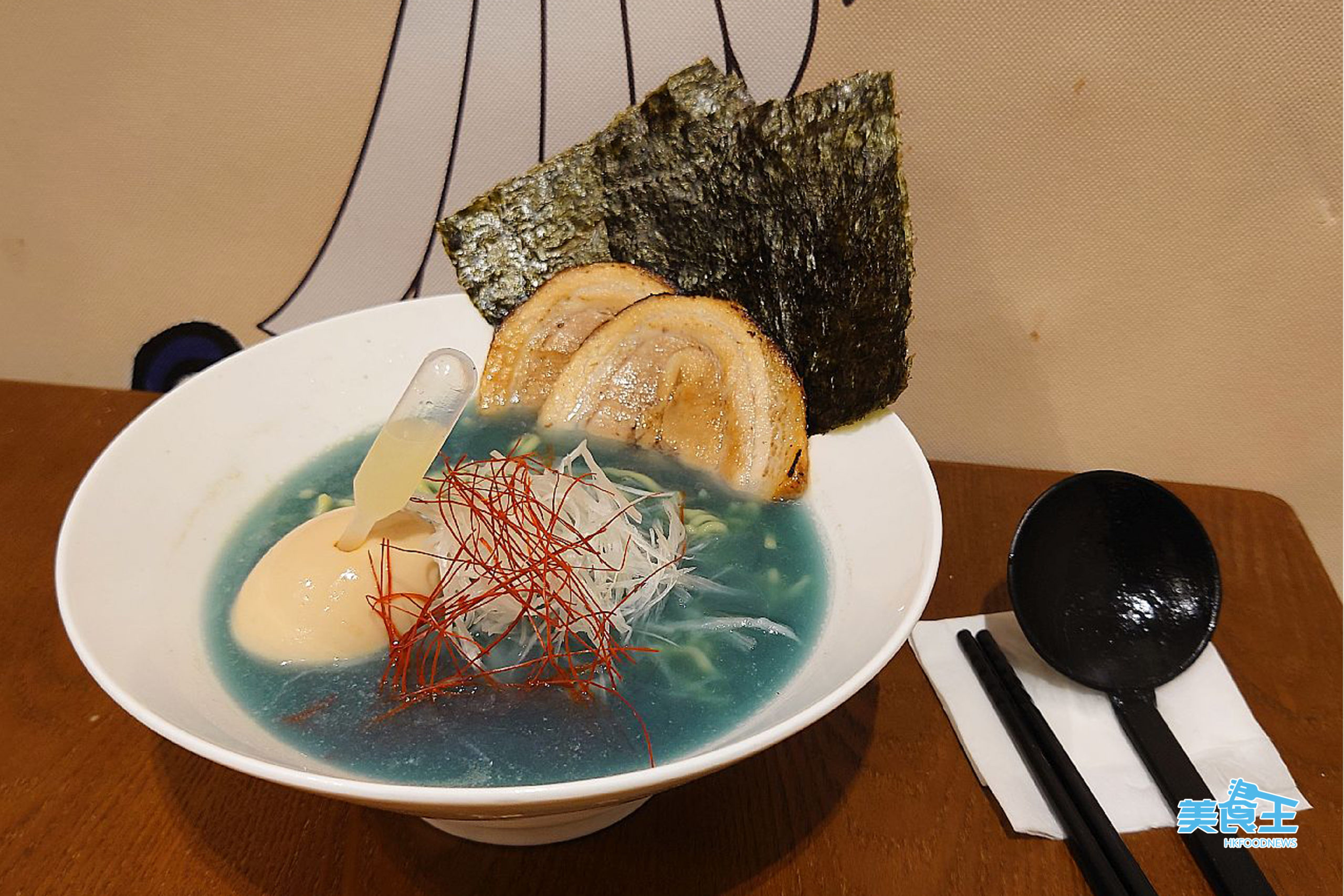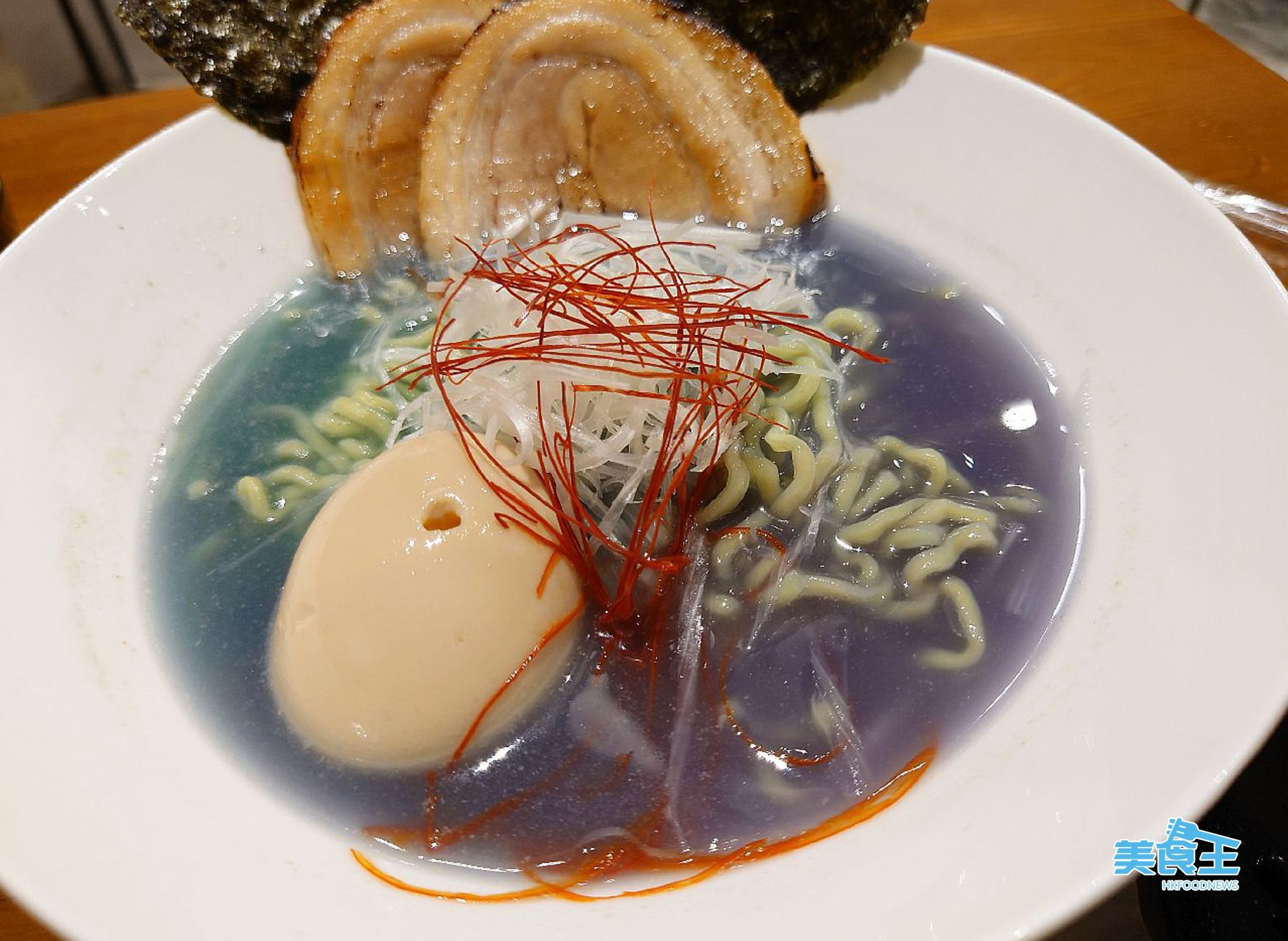 在季節限定的「清雞湯拉麵」外,店內還有一款在餐單上沒有的「特濃雞湯拉麵」($80)!兩者所用主料相若,但就沒有加上蝶豆花汁,不過其湯頭卻是比「清雞湯」濃郁一倍的「特濃雞湯」,所以雞味更香濃,且因湯頭如上文所說是限定的關係,故如點了一碗「特濃雞湯拉麵」後,就等同少了可做兩碗「清雞湯拉麵」的配額。