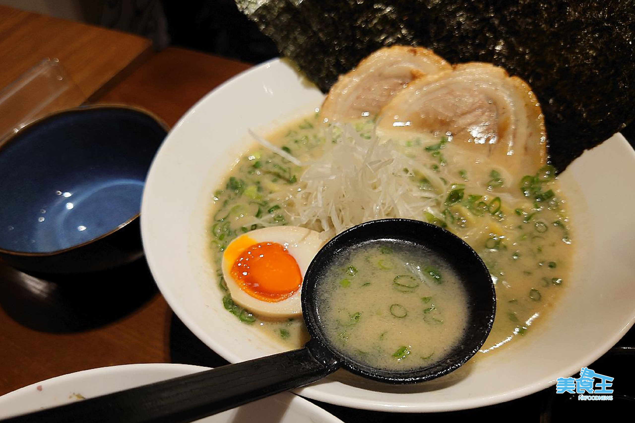 作為一個一個拉麵愛好者,加上出身日系正宗師傅,Maki 對拉麵的堅持自是很高,店內的拉麵採用九州傳統口味,她更一語點出如食材用上木耳而沒用筍的,就是九州拉麵。湯底是拉麵的靈魂,店內用的是 2 種自家特調湯底,一是豬骨湯,一為雞骨湯,濃厚達 7 至 8 度,絕對真材實料。因前者以 70 磅的豬筒骨、豬脊骨等,加上免治雞肉及豬手,連預備功夫花上 12 小時才熬製而成豬骨湯,故淺乳白色的湯中盡含骨髓、油份和膠質,味道濃厚;相對較簡單的雞湯 (下圖),其實也用了 20 公斤雞腳、雞殼及雞頸熬製 6 小時而成,隨上蔥花,隨著蔥花,日限約 100 碗;當中的豬骨湯再配上特調的醬汁,做成白、黑、赤、橙 4 種湯底的拉麵,兩者都是每日限量供應。