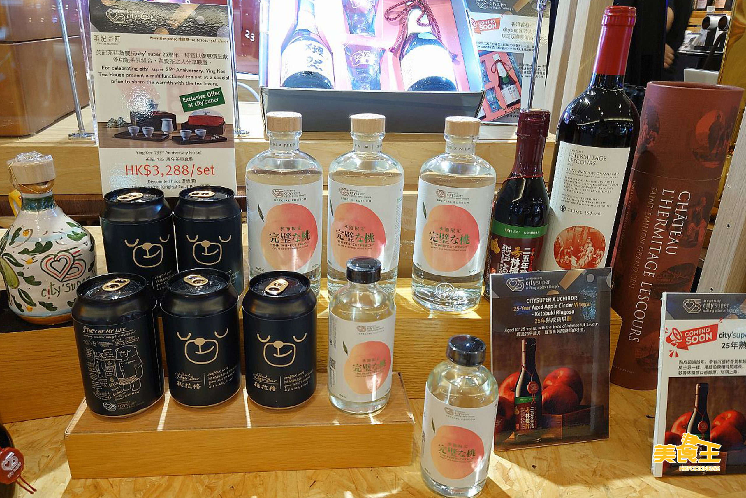 適逢集團成立 25 周年,著名設計師兼 city’super Logo 原創人陳幼堅 Alan Chan (上圖) 更首次於公眾發售他所設計的紅酒「法國 Chateau L’Hermitage Lescours Alan Chan Edition 紅葡萄酒 2015」($880/下圖右),與大家分享從旅途中挑選的佳品。品牌更於現場首次發售 city’super 版本蜜桃味手工氈酒 ($298/220ml、$598/500ml/下圖中);嚴選山梨縣極品水蜜桃作為原料、於香港本地製造的 city’super 25 周年特別版桃味慕尼黑拉格啤酒 ($45/下圖左),無須額外加糖,已有突出的清爽麥芽風味,值得一試。